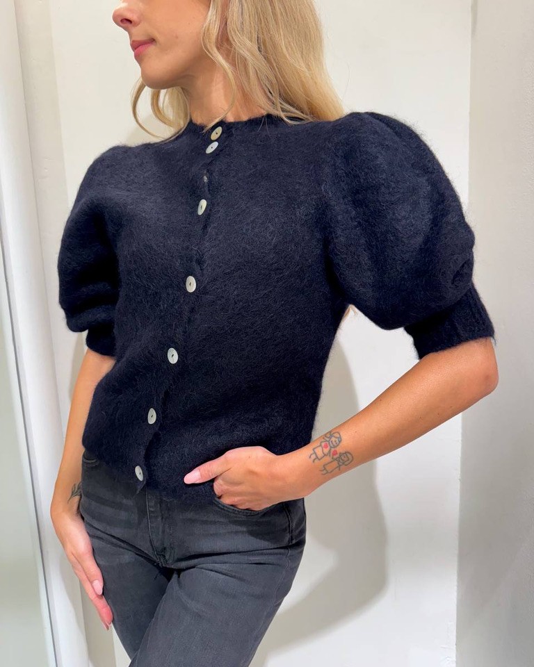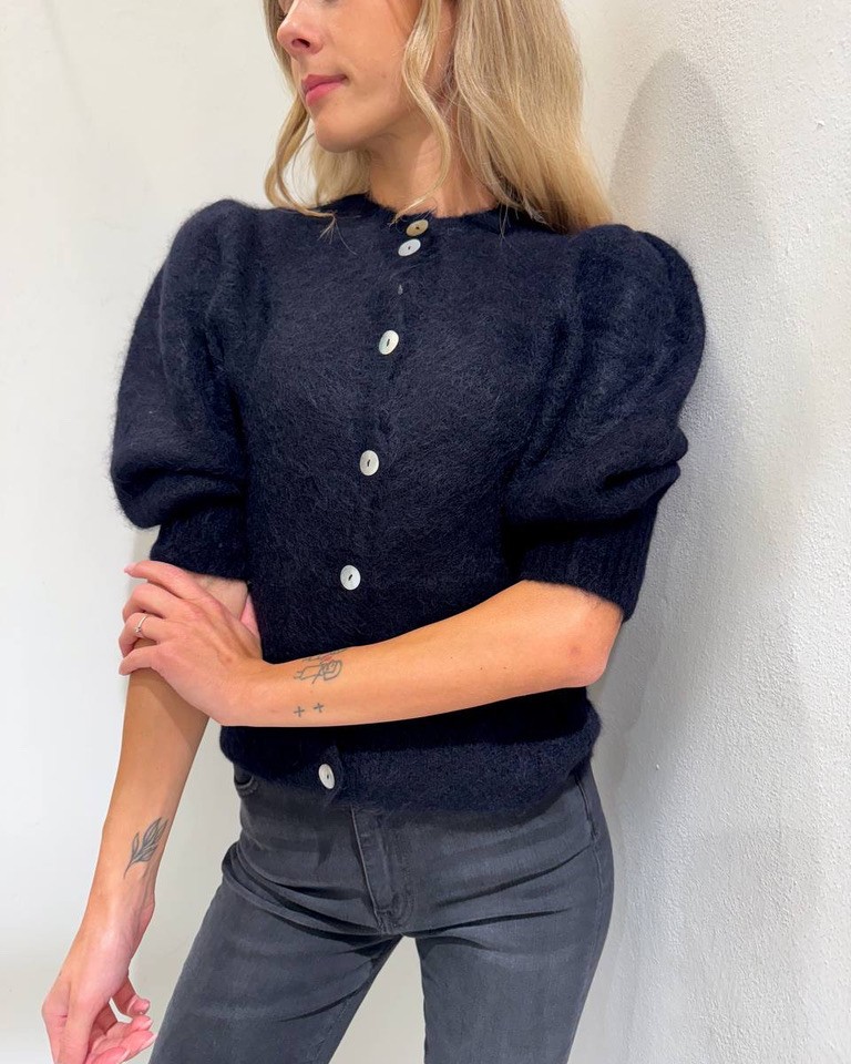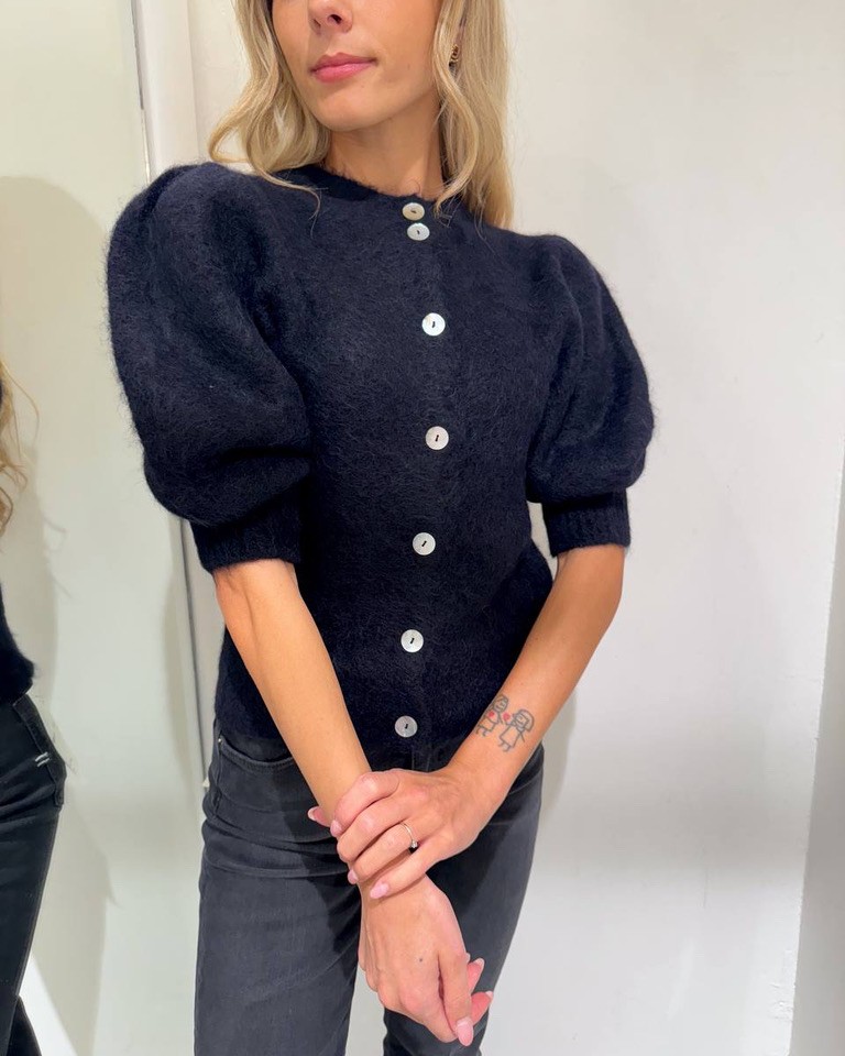 Cardigan color nero in lana e alpaca, modello girocollo, mezze maniche a sbuffo e palloncino con elastico alto sul fondo. Chiusura frontale con bottoni. Vestibilità regolare.