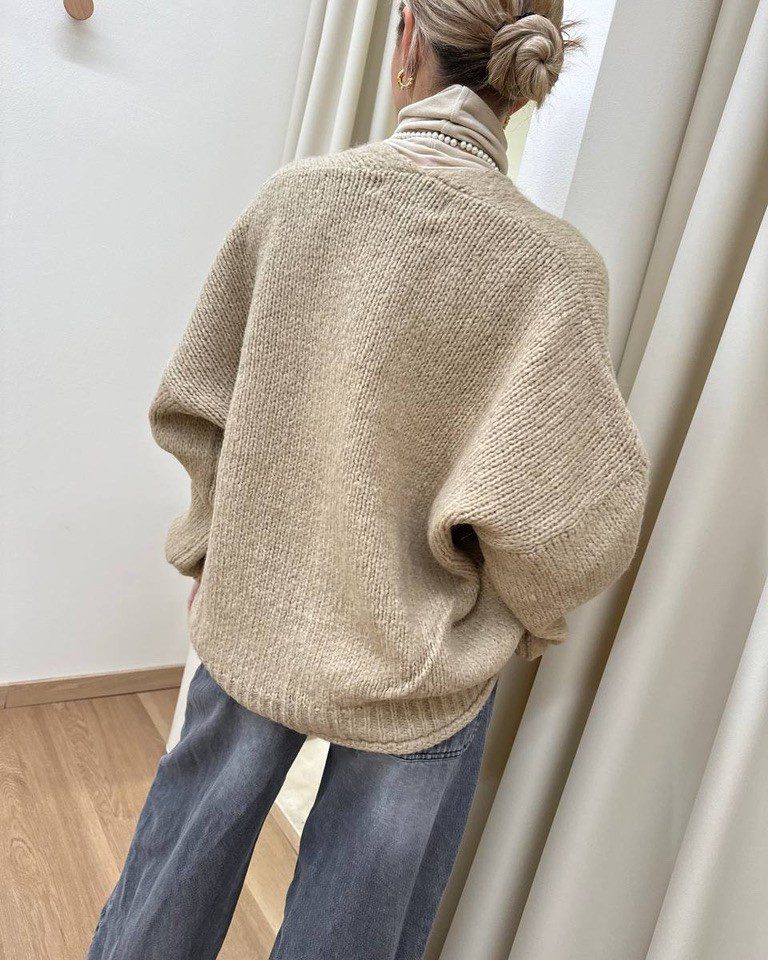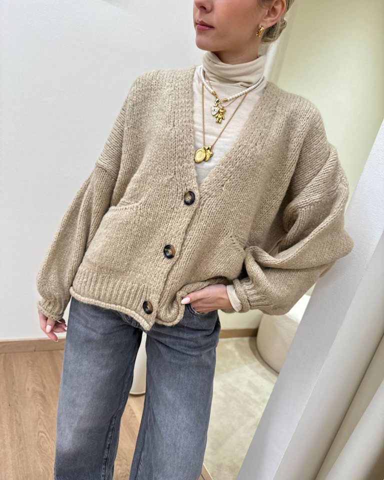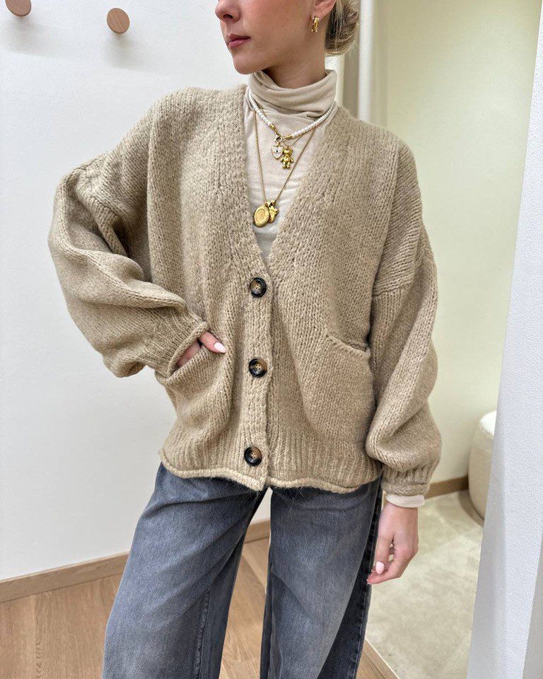 Cardigan beige in viscosa e lana, modello oversize con maniche lunghe scese a palloncino. Scollo a V, tasche applicate laterali e chiusura frontale con bottoni in legno. Vestibilità morbida e ampia.