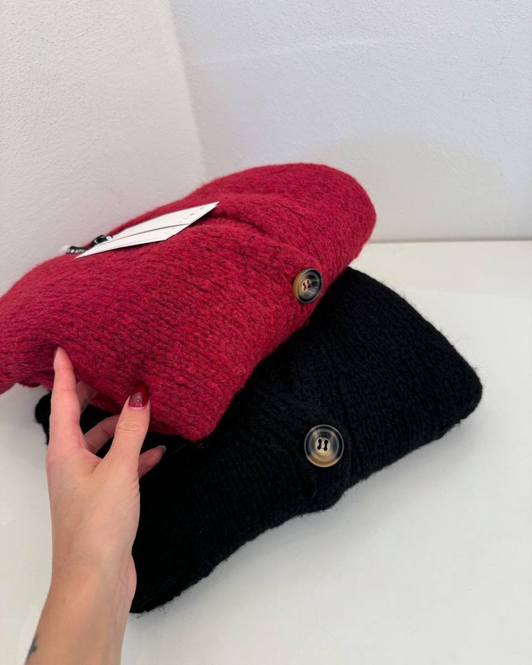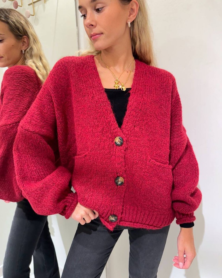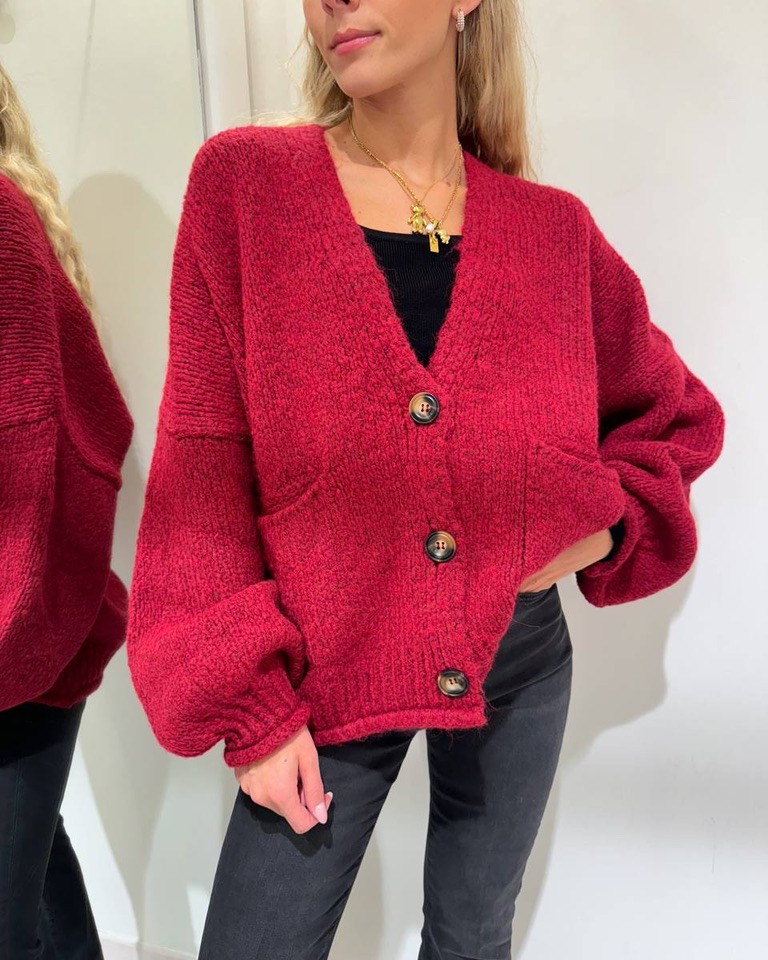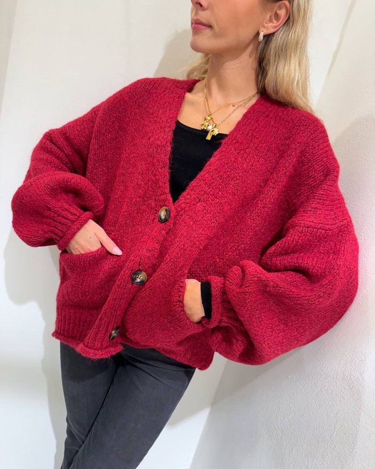 Cardigan vino in viscosa e lana, modello oversize con maniche lunghe scese a palloncino. Scollo a V, tasche applicate laterali e chiusura frontale con bottoni in legno. Vestibilità morbida e ampia.