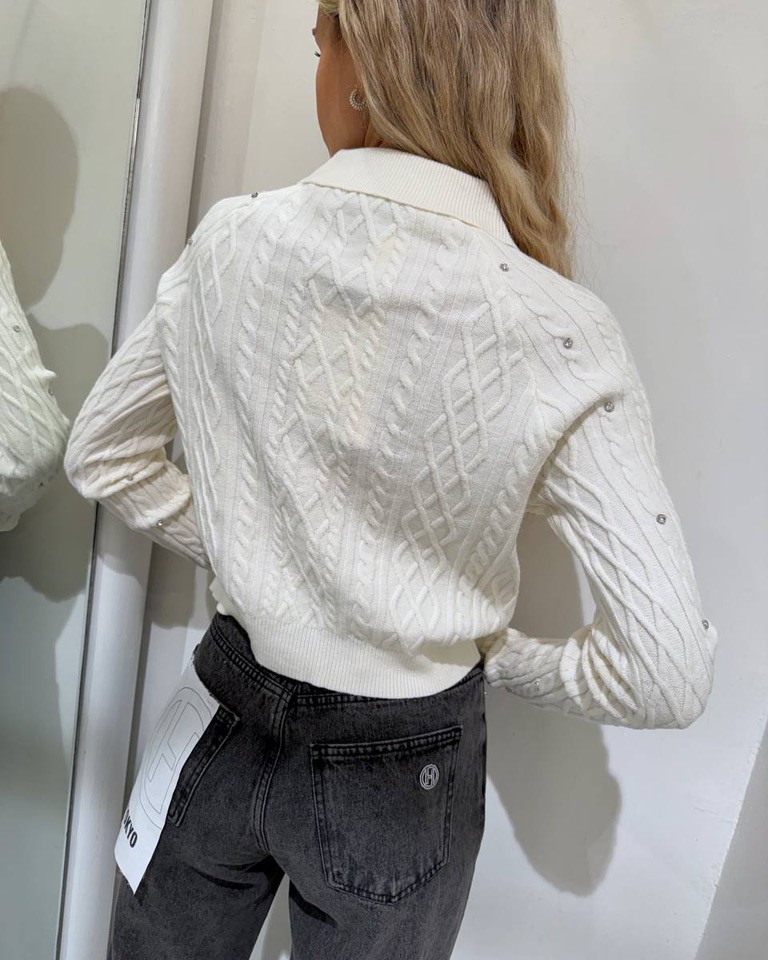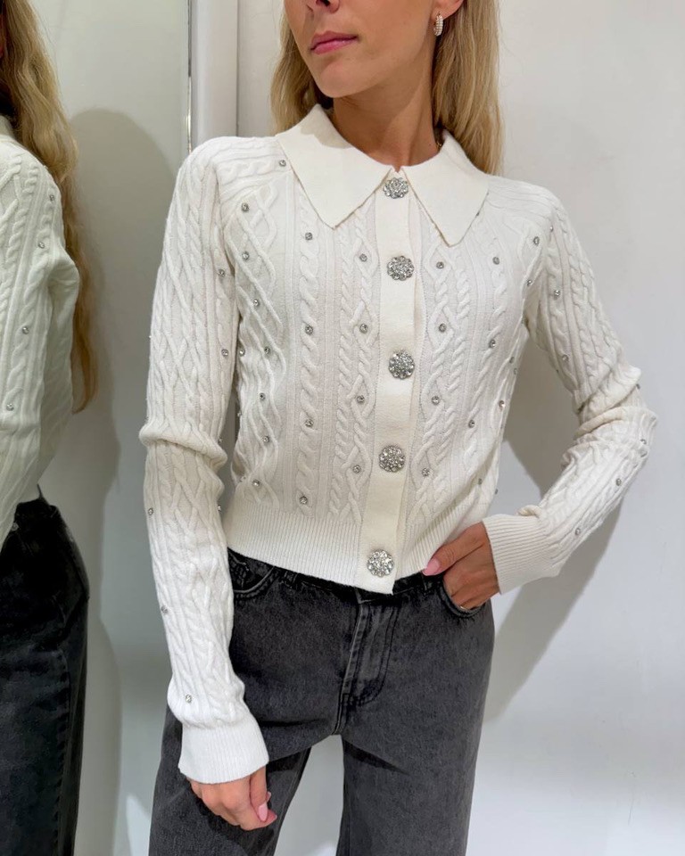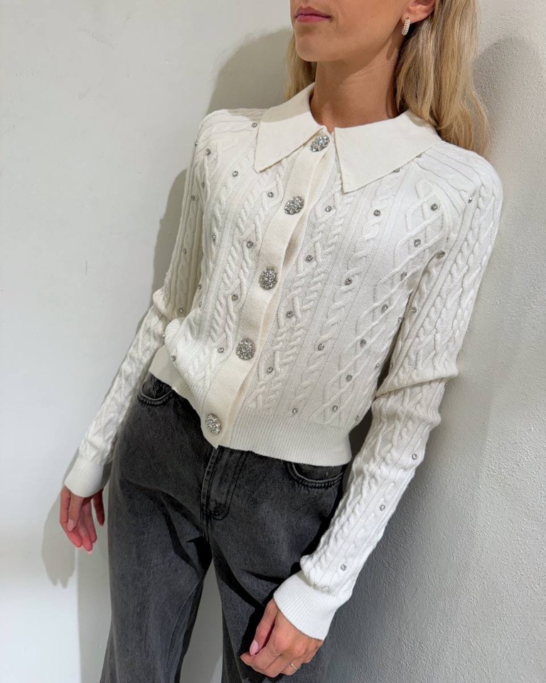 Cardigan in maglia in viscosa color burro, modello con trecce e strass, colletto, maniche lunghe e chiusura frontale con bottoni gioiello. Elastici su polsi e fondo a coste. vestibilità regolare ed elasticizzata.