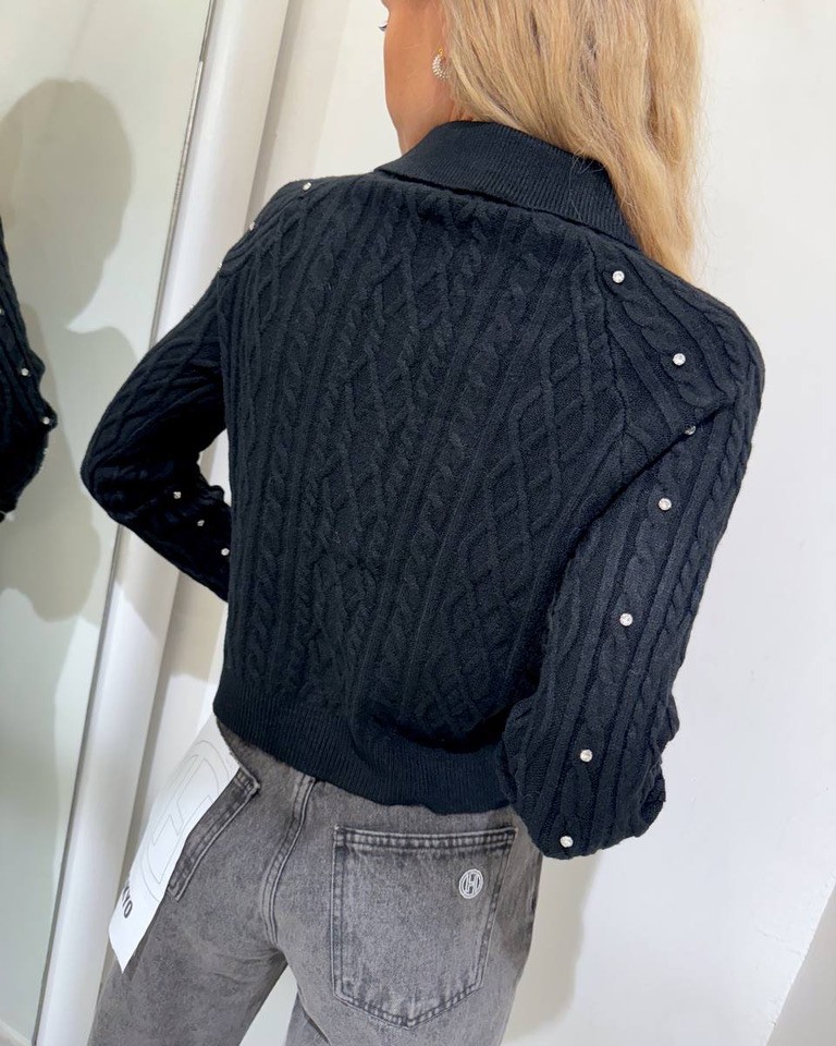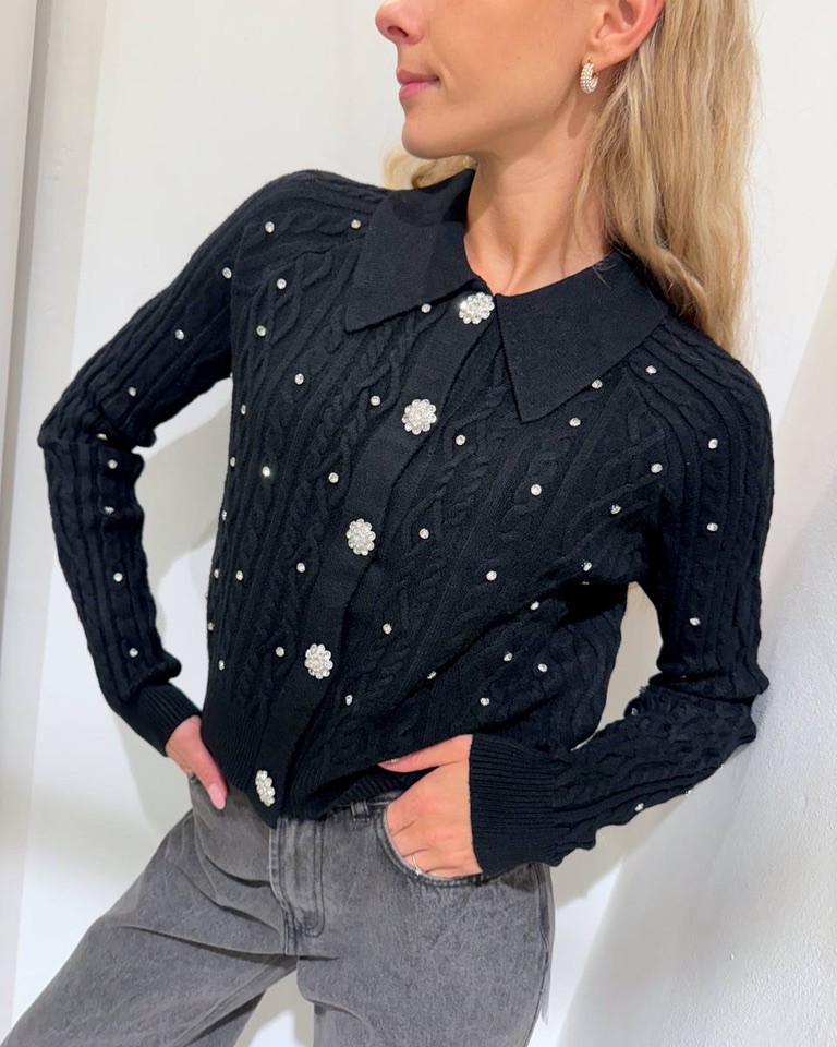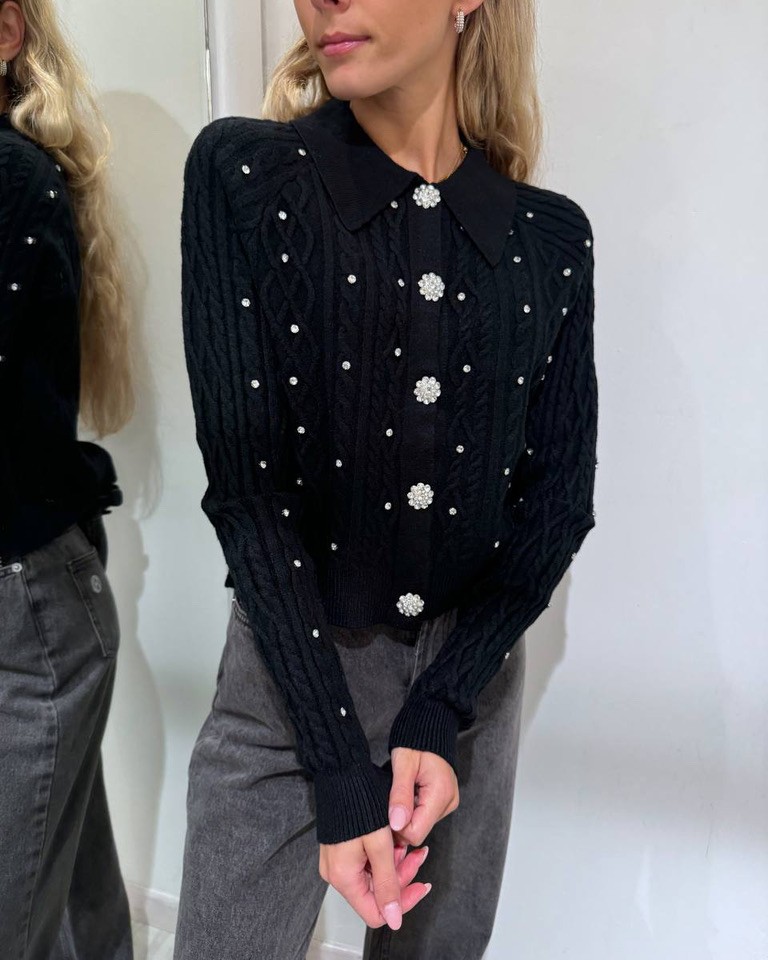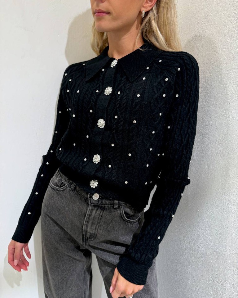 Cardigan polo nero con trecce e bottoni gioiello HaveOne