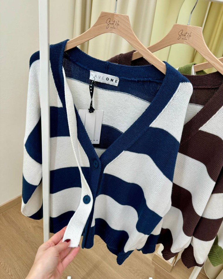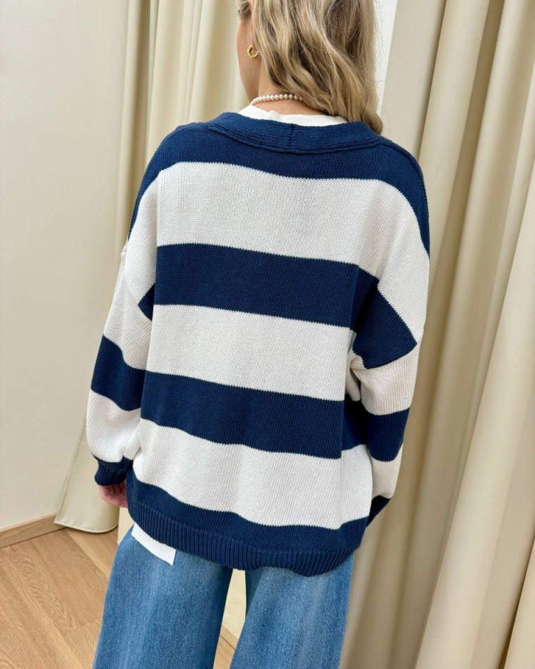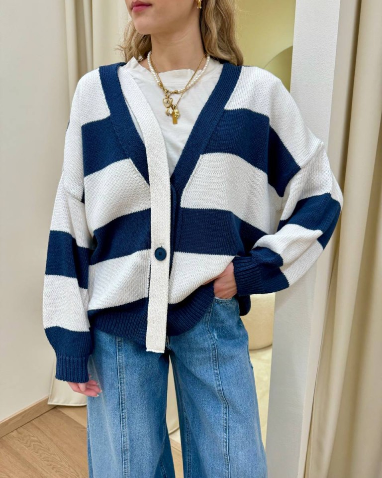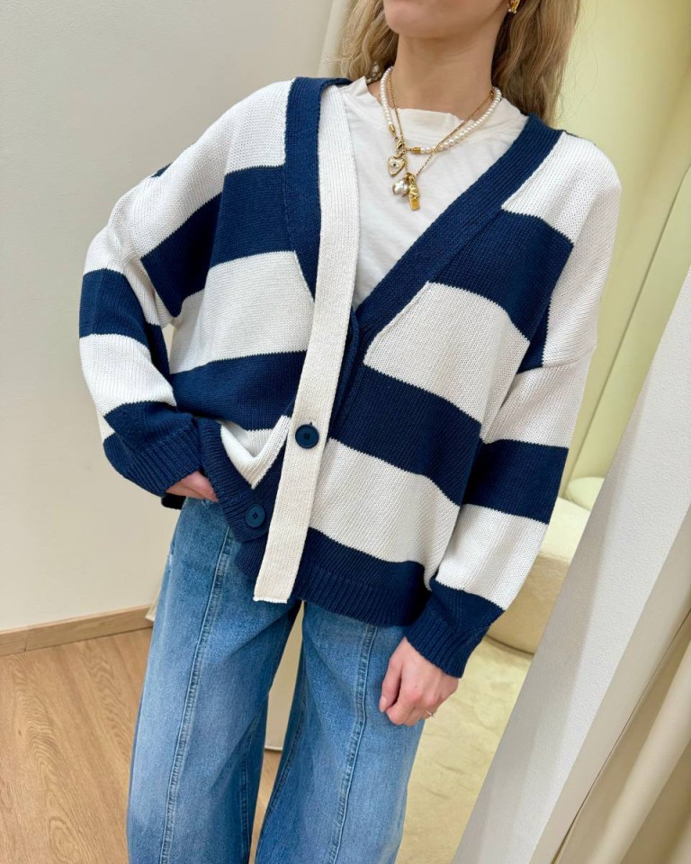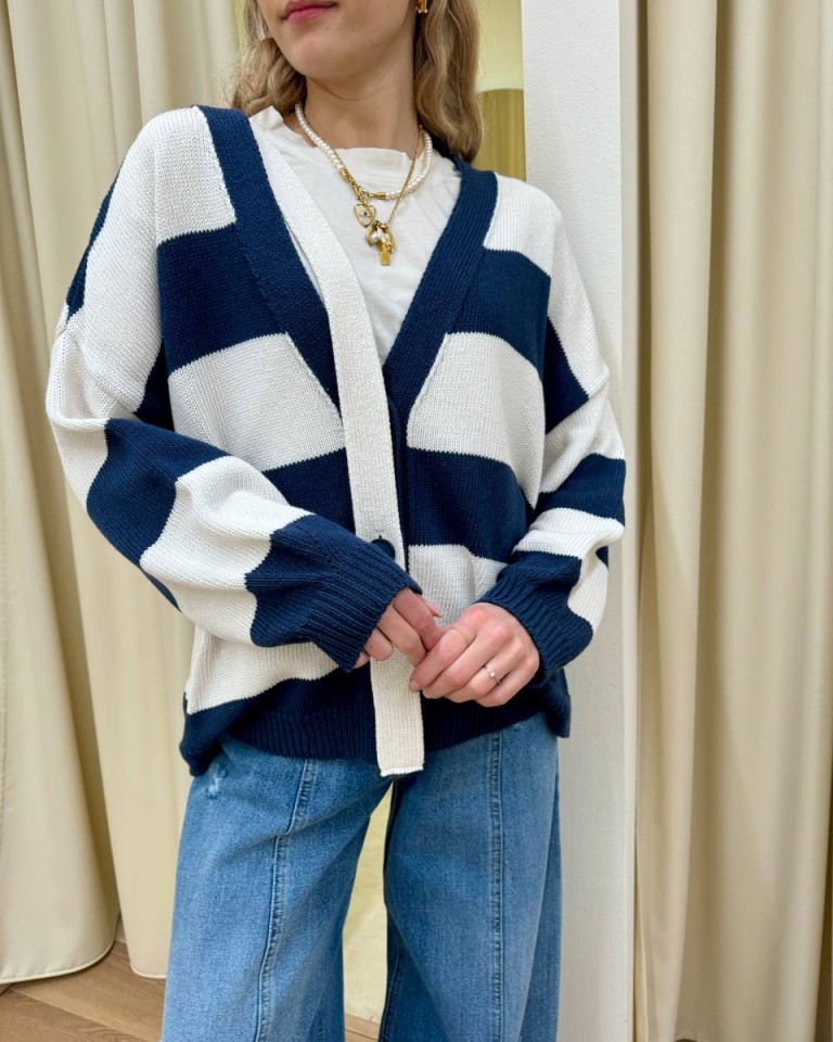 Cardigan a righe blu e panna, modello oversize, scollo a V, manica lunga a sbuffo e giro sceso, particolarità laccio davanti, chiusura con bottoni. Vestibilità ampia.