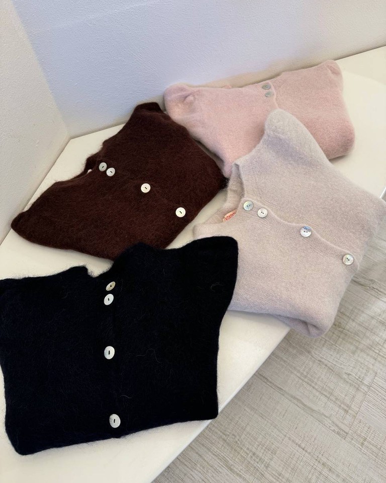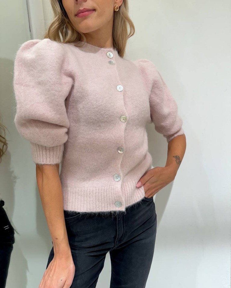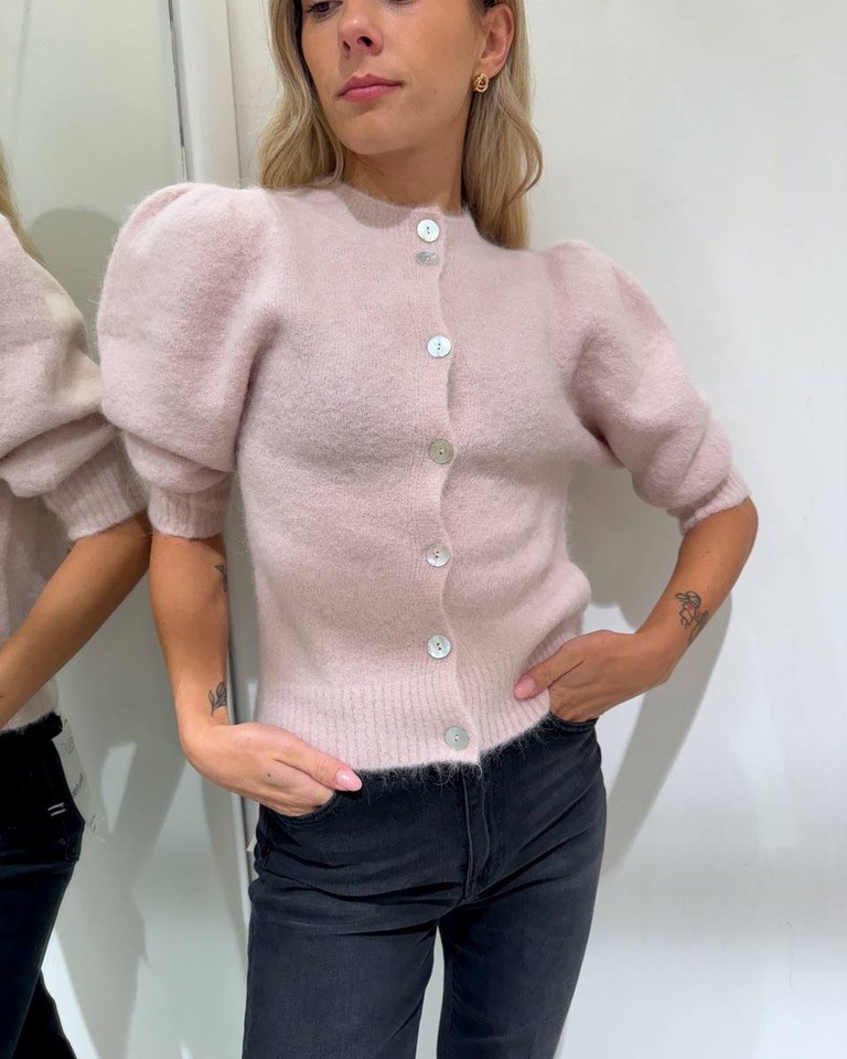 Cardigan color rosa cipria in lana e alpaca, modello girocollo, mezze maniche a sbuffo e palloncino con elastico alto sul fondo. Chiusura frontale con bottoni. Vestibilità regolare.