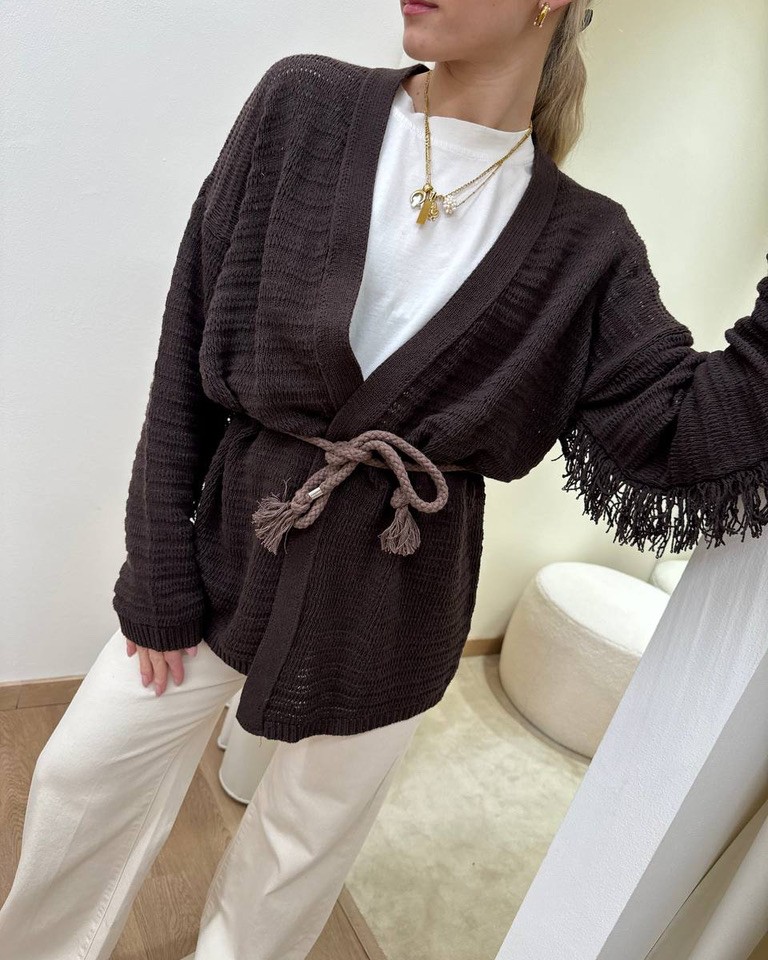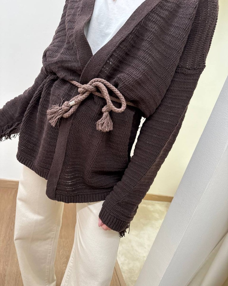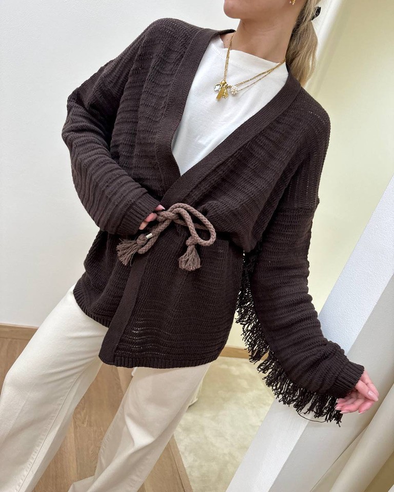 Cardigan in maglia traforato moro, modello dritto, manica lunga con frange, giro sceso, cinturino abbinato effetto corda in tono. Vestibilità regolare.