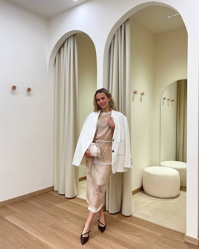 Un completo con gonna midi e blusa color cipria con delicate paillettes che illuminano l’outfit, abbinato a un blazer bianco strutturato che da carattere. Completano il look una mini bag coordinata e décolleté scure a punta con cinturino.