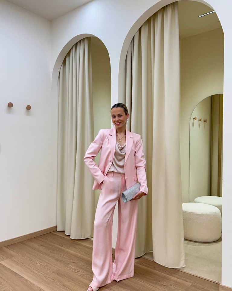 Per un matrimonio il tailleur è sempre una scelta perfetta e se la cerimonia cade in primavera un completo con tessuti leggeri e fluidi nei toni pastello sarà ancora più chic, come questo tailleur rosa pastello in tessuto leggero e semilucido che dona luminosità ad ogni movimento, abbinato ad un top drappeggiato nei toni neutri per rendere il tutto iù elegante e per completare l’outfit delle scarpe nude e una pochette con strass argento sono perfetti.