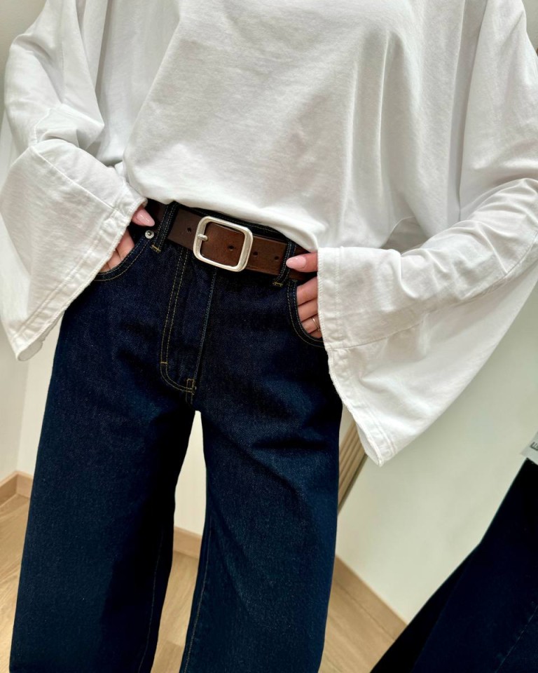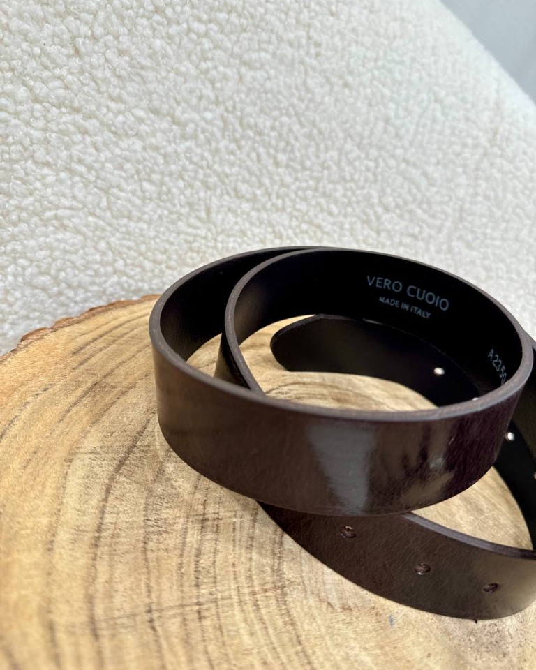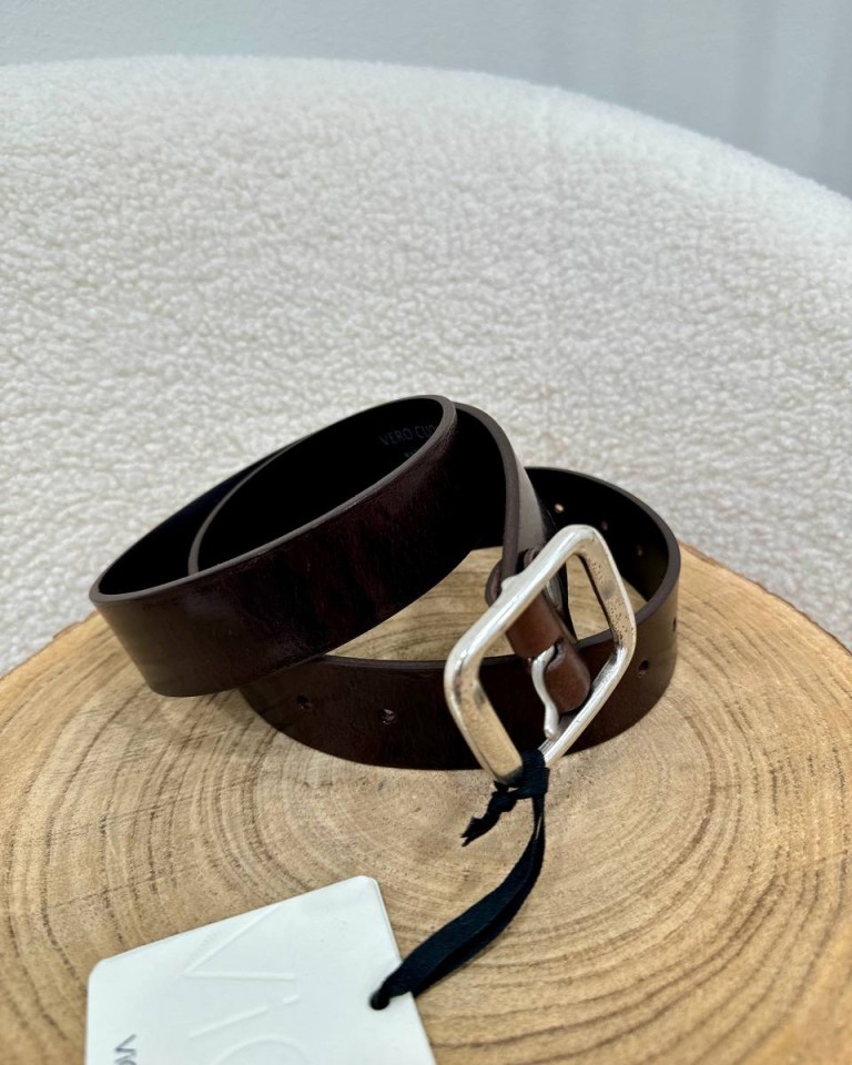 Cintura in vera pelle color moro, fibbia liscia, squadrata argentata. Lunghezza: 108 cm compresa fibbia.