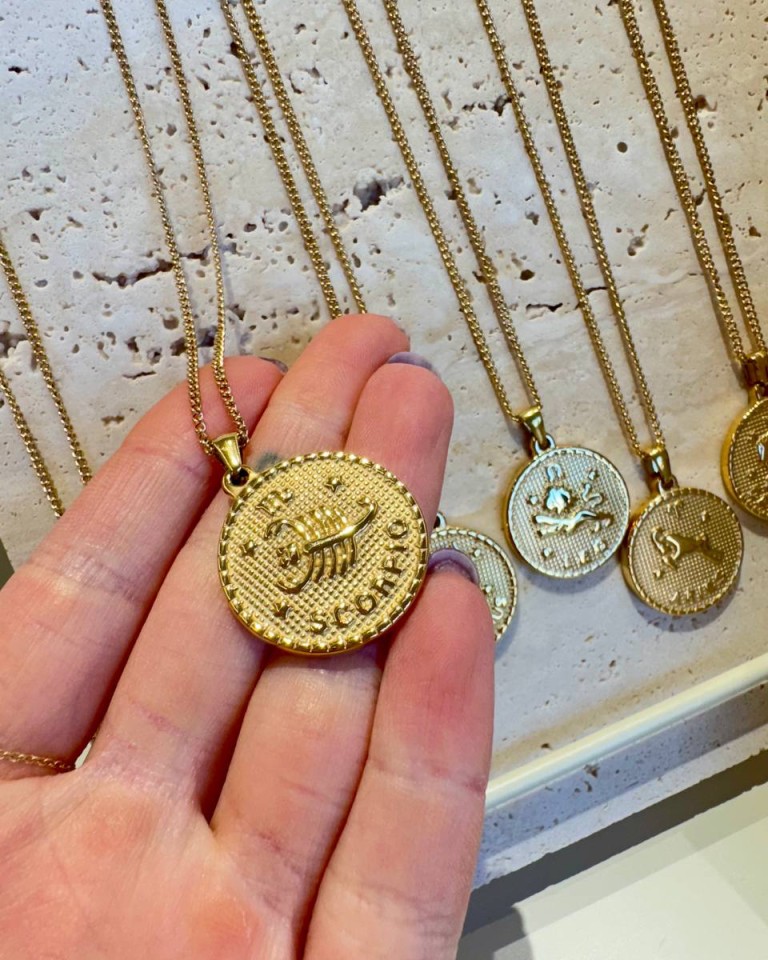 Collana segno zodiacale Scorpione, modello a catena fine con charm a medaglia dorato, chiusura con moschettone.