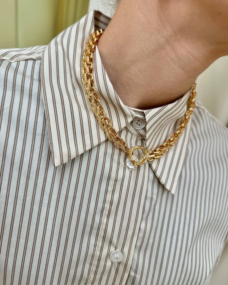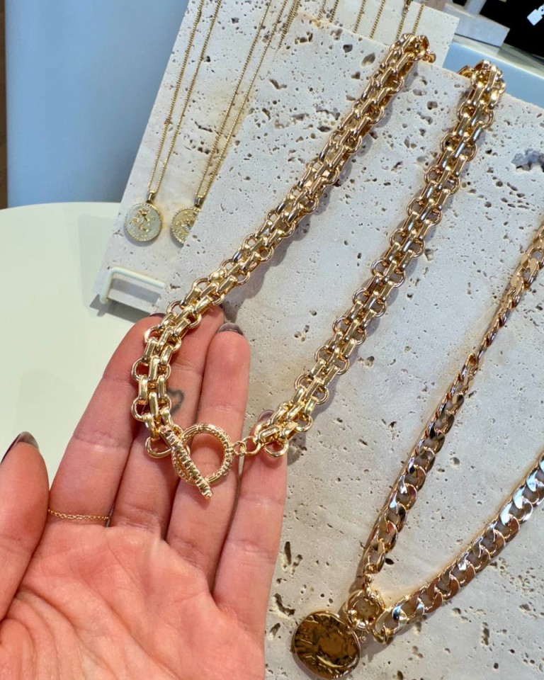 Collana Thick Link, modello a catena fitta dorata, chiusura dietro ad incastro.