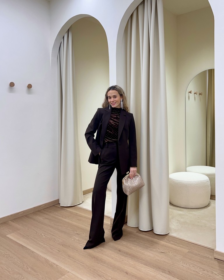 Per chi ama il color block e vuole sperimentare anche la notte di Capodanno questo outfit è l’ideale. Giocato tutto sui toni del moro, una delle tonalità protagoniste di questo anno, un tailleur sartoriale ed elegante abbinato ad un top in velluto arricchito da strass che crea continuità ma con un tocco brillante. Per concludere delle decolletè nere a punta che slanciano ulteriormente la figura, e per essere ancora più luminosa una pochette in paillettes color champagne e degli orecchini con una cascata di strass sono perfetti.