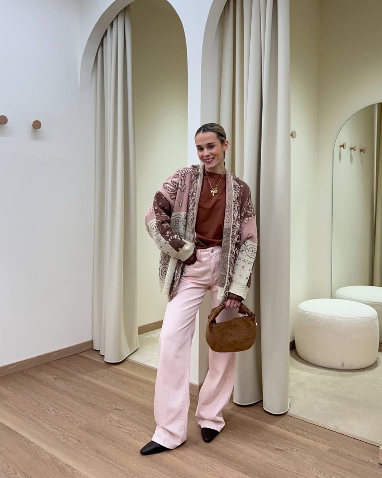 La t-shirt color tabacco dona profondità al look e si armonizza perfettamente con il cardigan morbido dalle nuance naturali. I pantaloni rosa pastello, dal taglio ampio e fluido, illuminano l’insieme con un tocco fresco e contemporaneo.