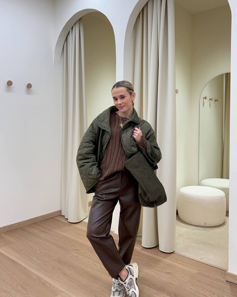 La giacca trapuntata verde bosco aggiunge carattere e un tocco casual chic, perfetta da sovrapporre al maglione a costine con rotture testa di moro. I pantaloni in tonalità coordinata slanciano la silhouette e rendono il look armonioso e sofisticato.
