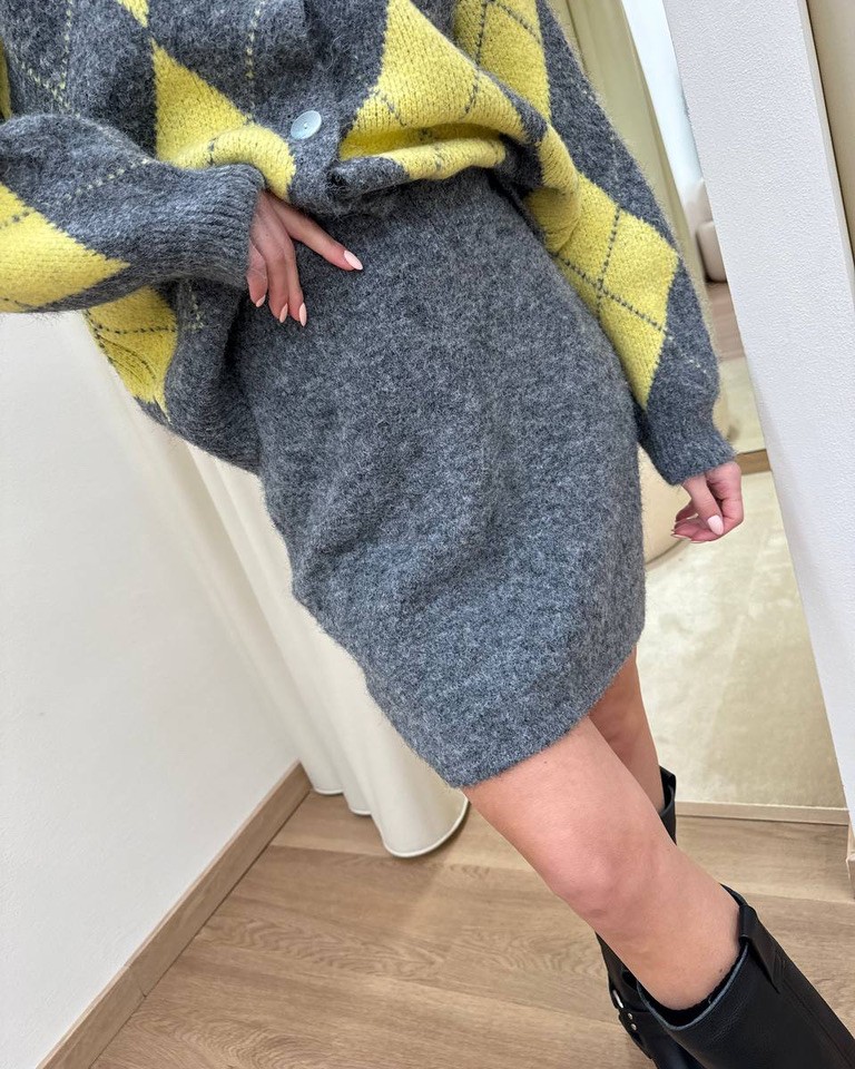 Set coordinato in maglia con alpaca e lana. Cerdigan a rombi grigio e lime, modello over, girocollo con bottoni madreperla e metallico sullo scollo, manica scesa, costine su polsi, collo e fondo. Minigonna in maglia grigia aderente, vita alta, con costine ed elastico in vita. Vestibilità ampia/regolare.