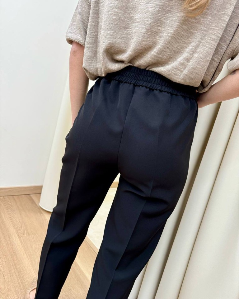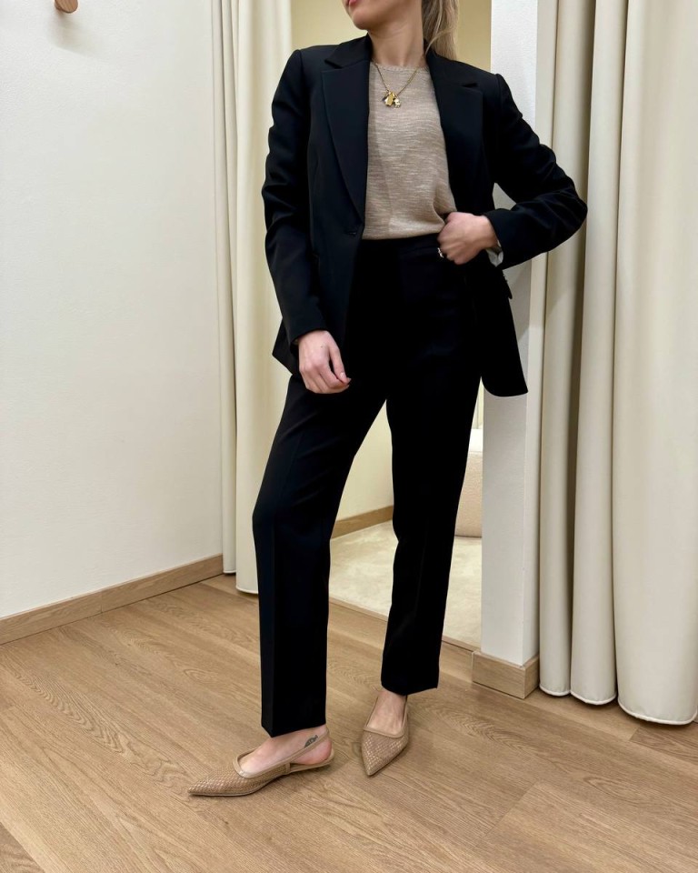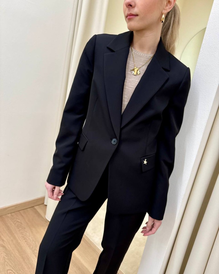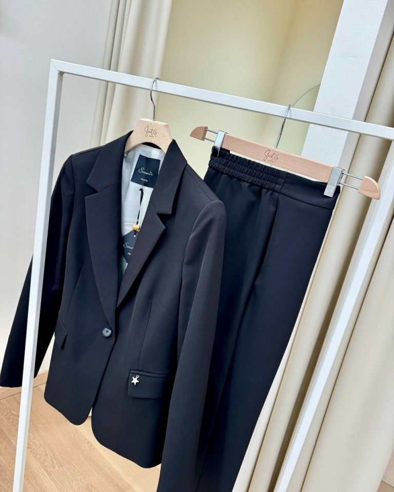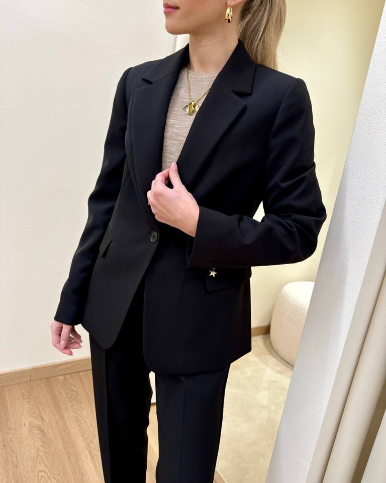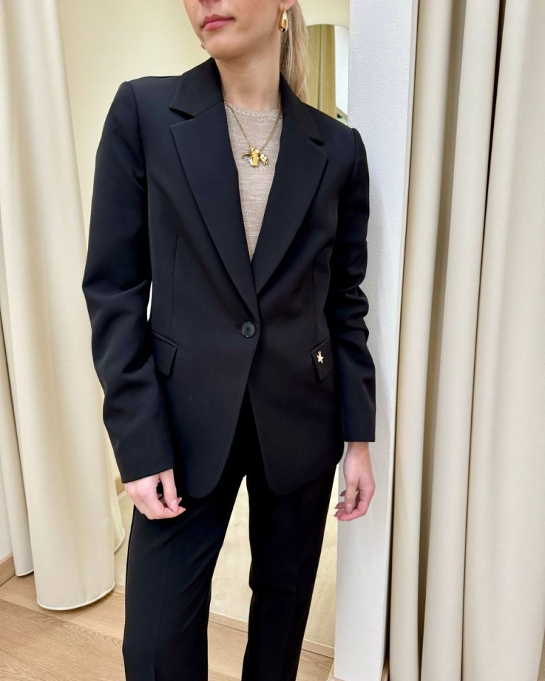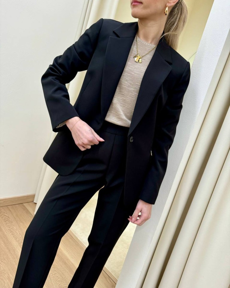 Completo giacca e pantalone nero, pantalone classico a sigaretta, vita alta con elastico, giacca leggermente avvitata, rever classico, chiusura con un bottone, tasche con patta. Vestibilità regolare.