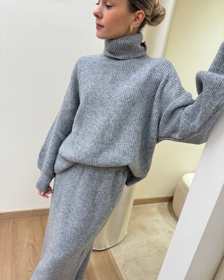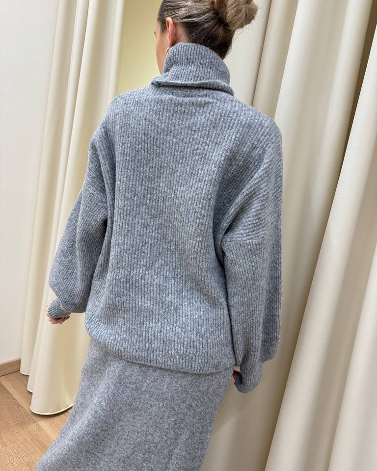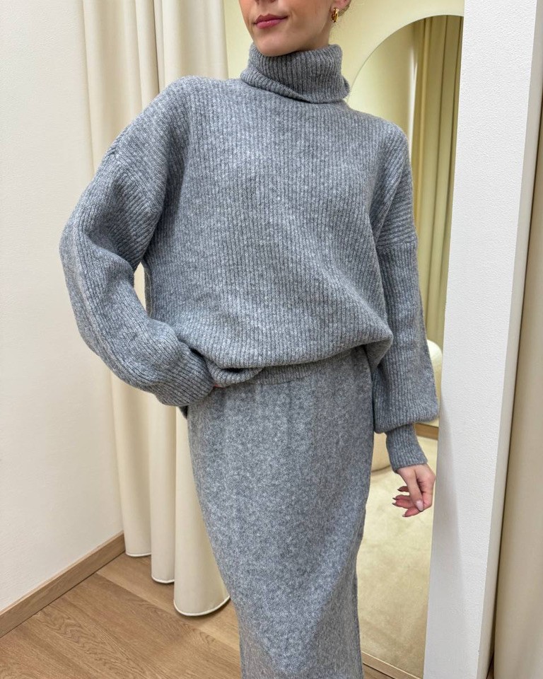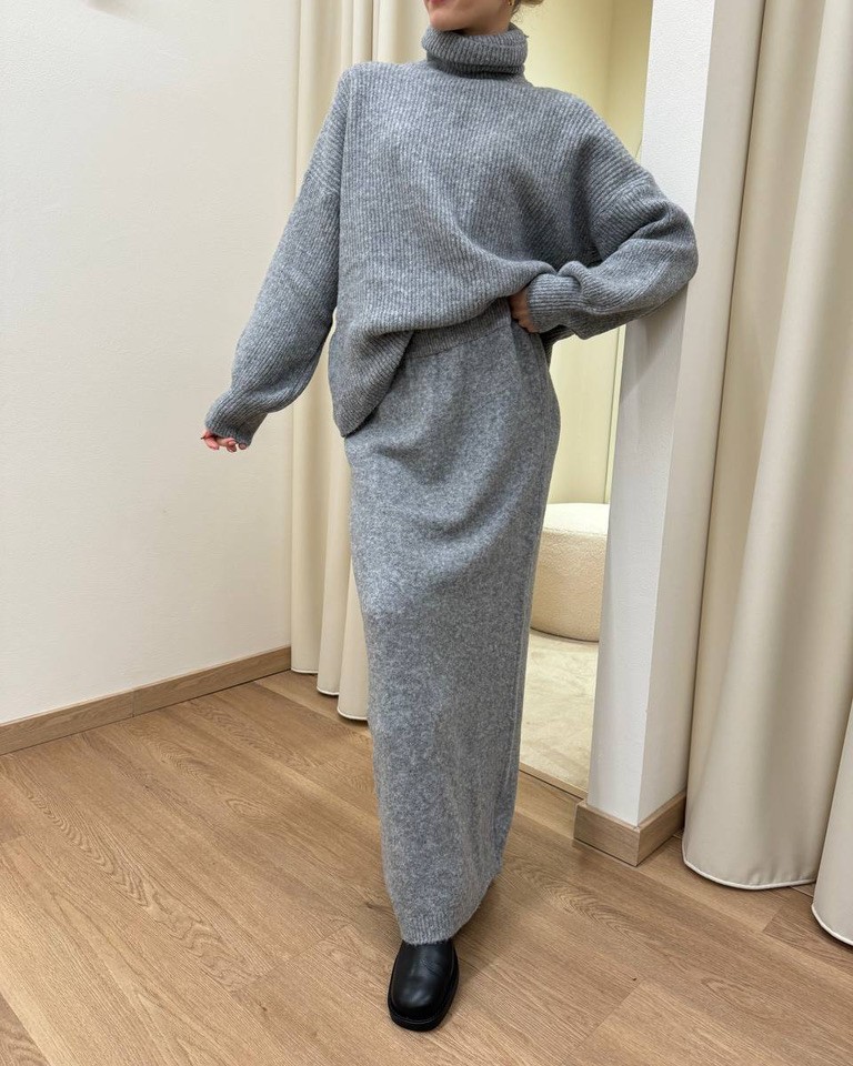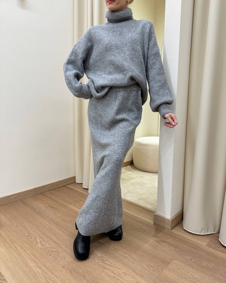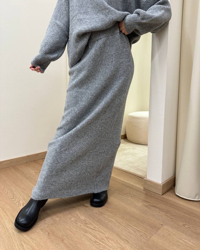 Completo in maglia con lana color grigio. Composto da gonna lunga con costine ed elastico in vita e maglia ampia a costine con collo alto maniche lunghe scese a palloncino sul fondo e costine su polsi. Vestibilità morbida.