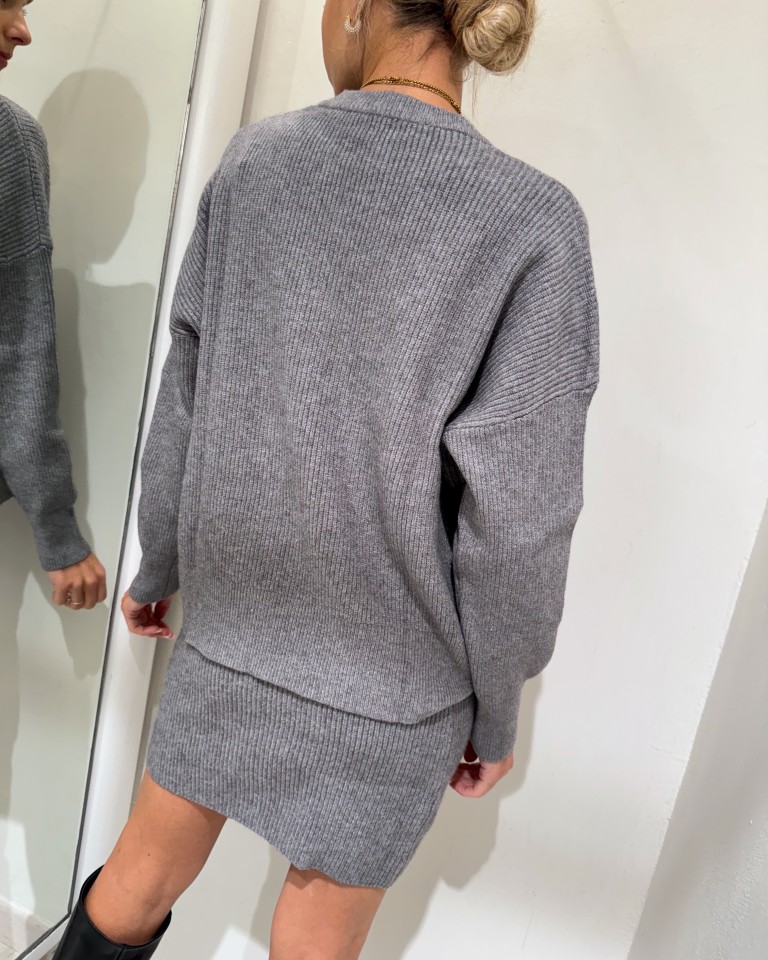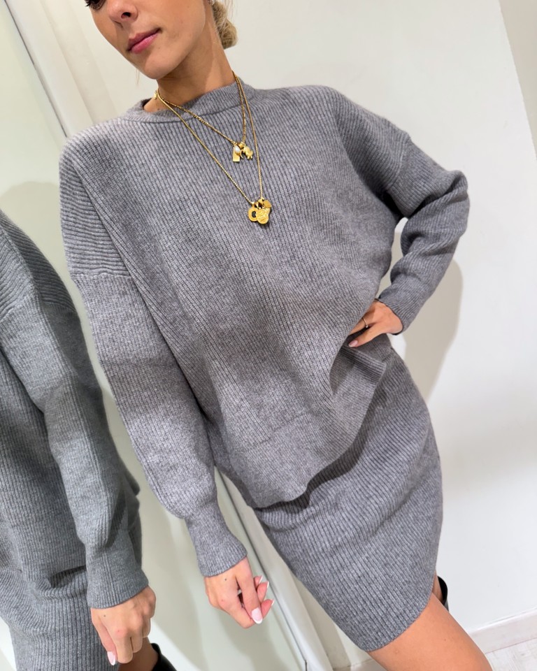 Set coordinato in viscosa color grigio, composto da minigonna a coste con elastico e maglia oversize, girocollo a coste con elastico polsi e fondo. Vestibilità morbida elasticizzata.