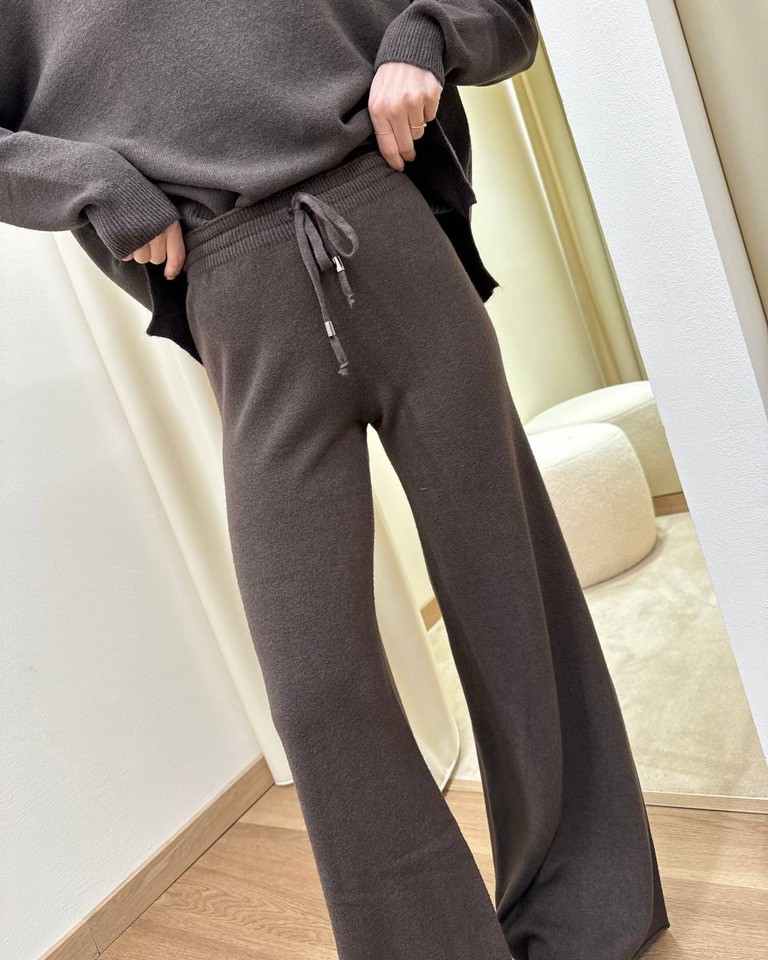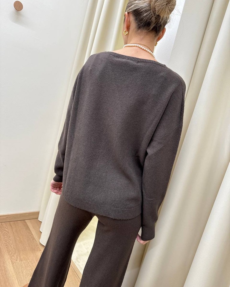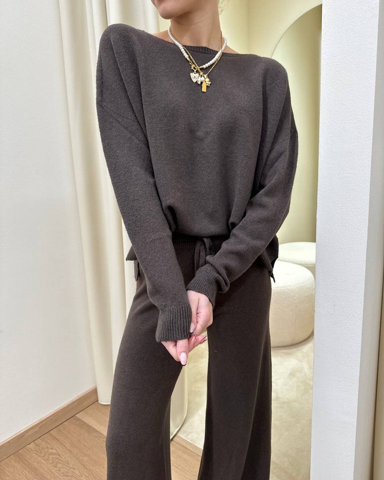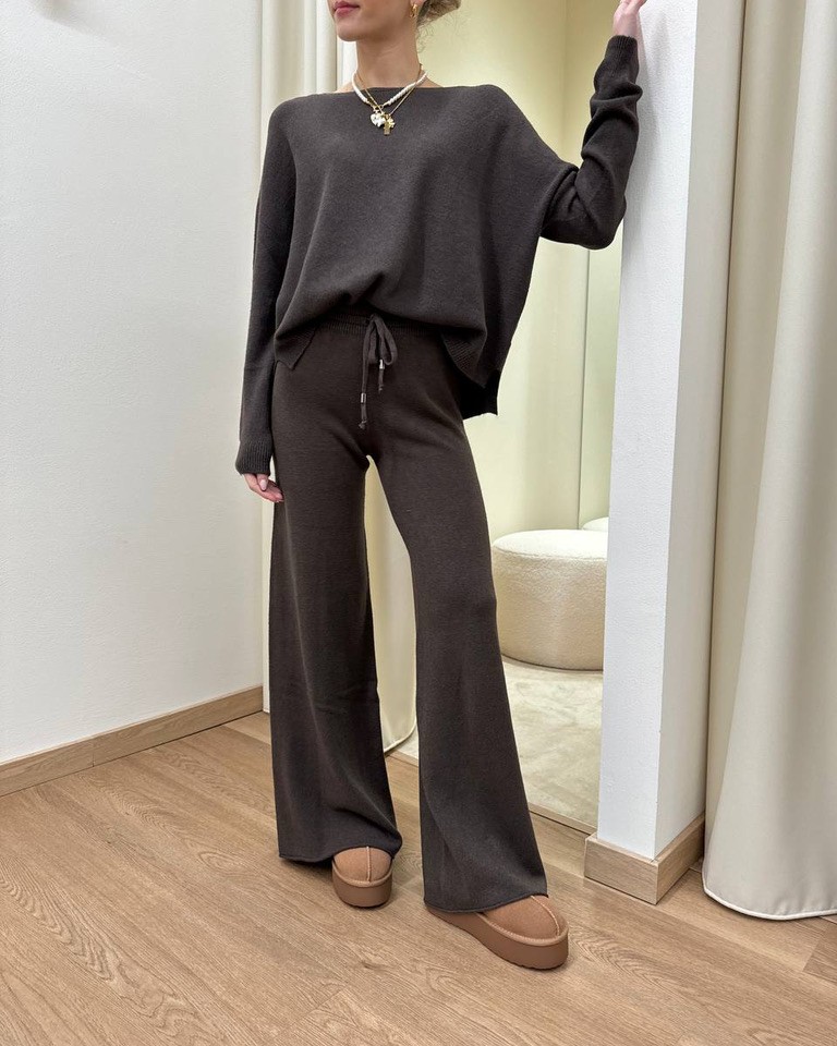 Completo in maglia con viscosa color moro. Composto da pantalone palazzo con coulisse in vita medio alta e maglia ampia girocollo con maniche lunghe scese e costine su polsi e fondo con spacchetti laterali, dietro leggermente più lungo del davanti. Vestibilità morbida.