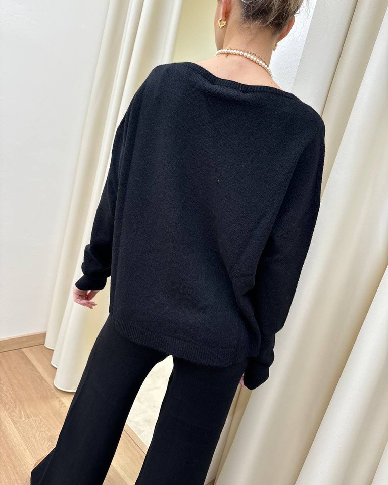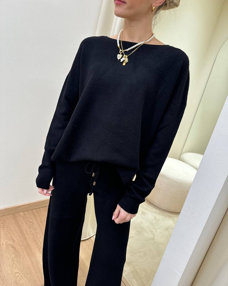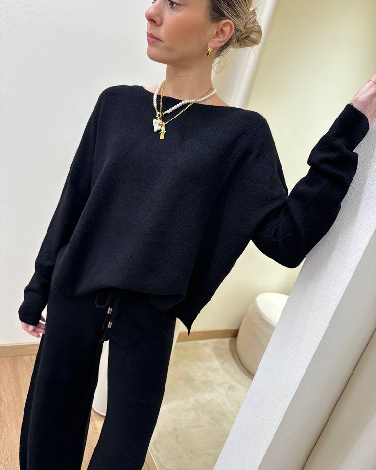 Completo in maglia nero con viscosa. Composto da pantalone palazzo con coulisse in vita medio alta e maglia ampia scollo a barchetta con maniche lunghe scese e costine su polsi e fondo con spacchetti laterali, dietro leggermente più lungo del davanti. Vestibilità morbida.