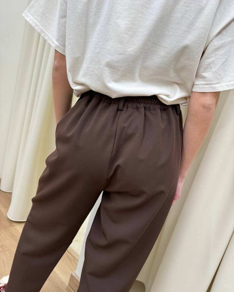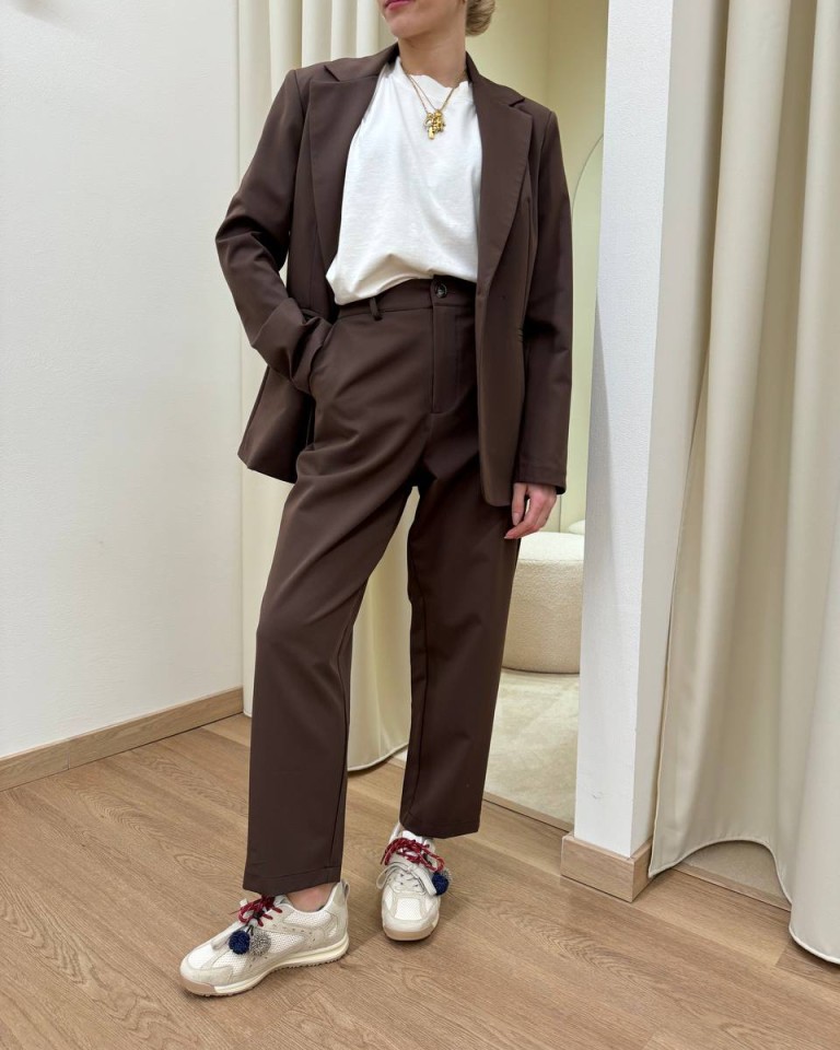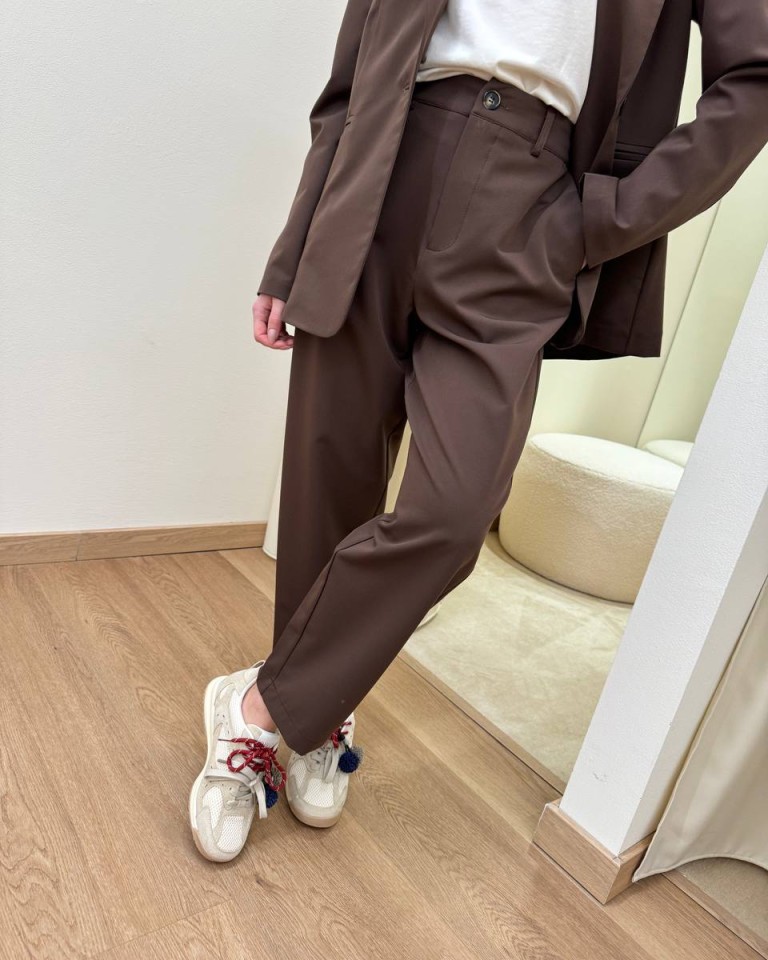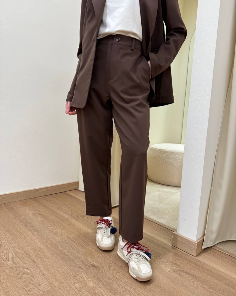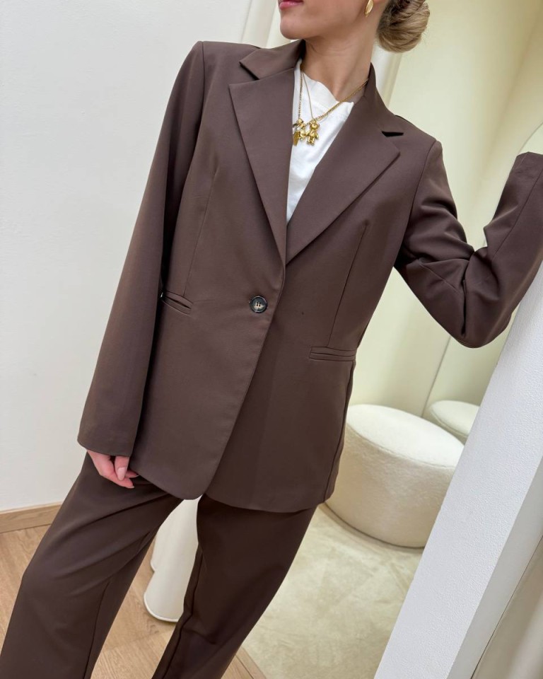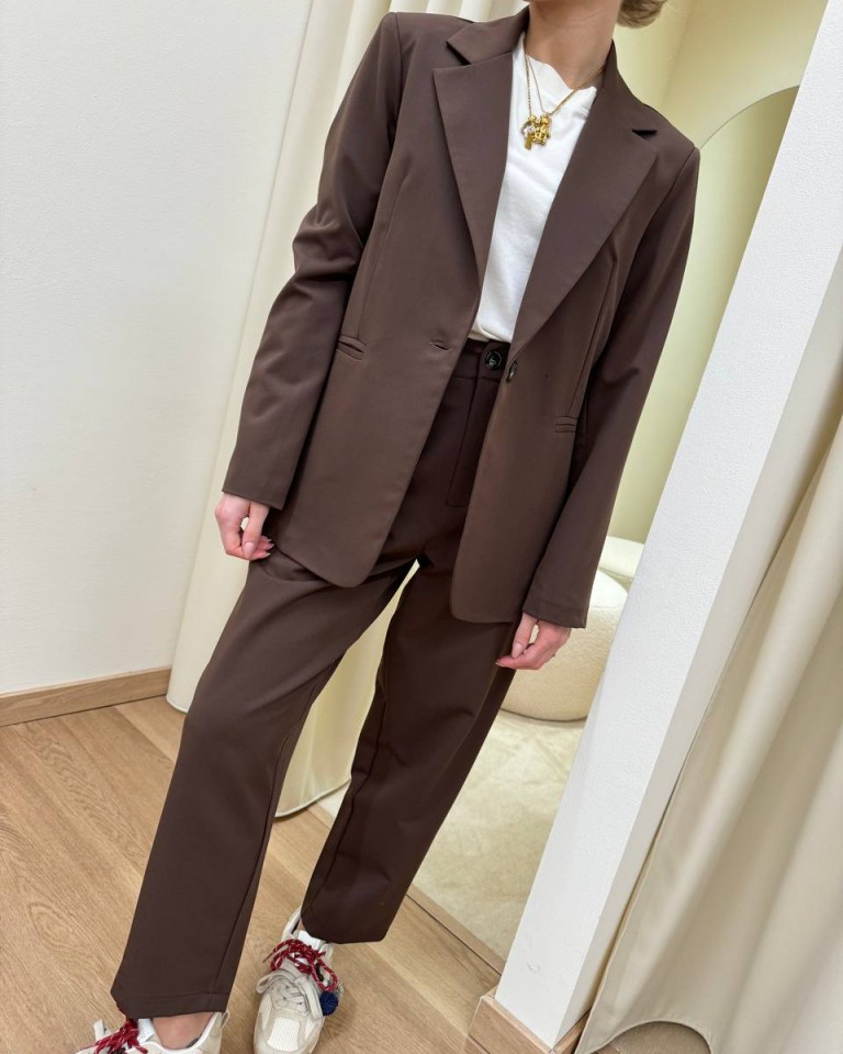 Completo moro formato da giacca con rever classico, manica lunga, tasche a filetto e chiusura con un bottone davanti e da pantalone a sigaretta a vita alta con elastico dietro e tasche laterali. Chiusura con zip e bottone. Vestibilità regolare.