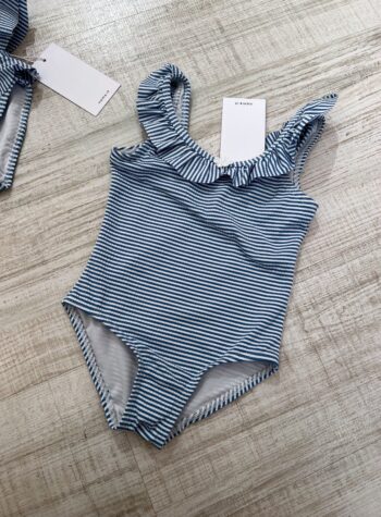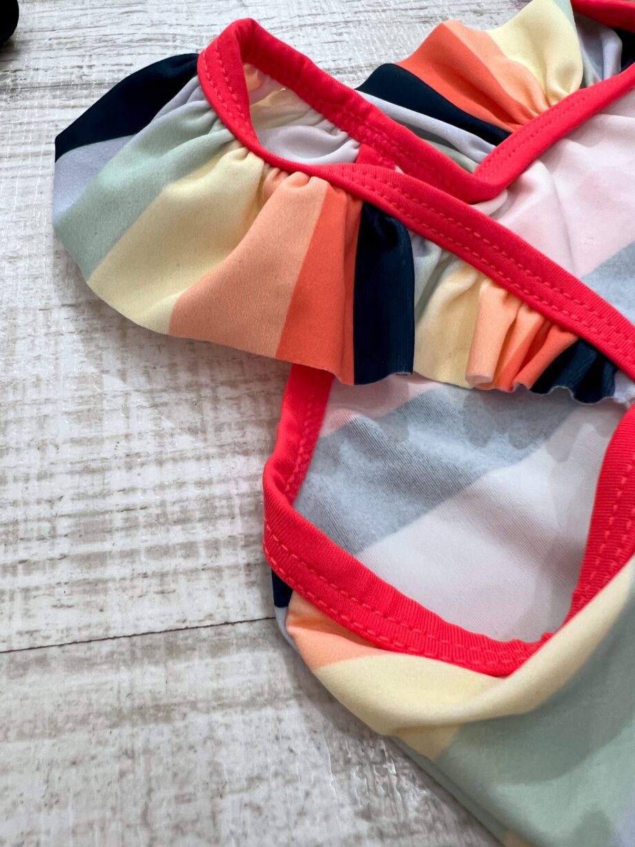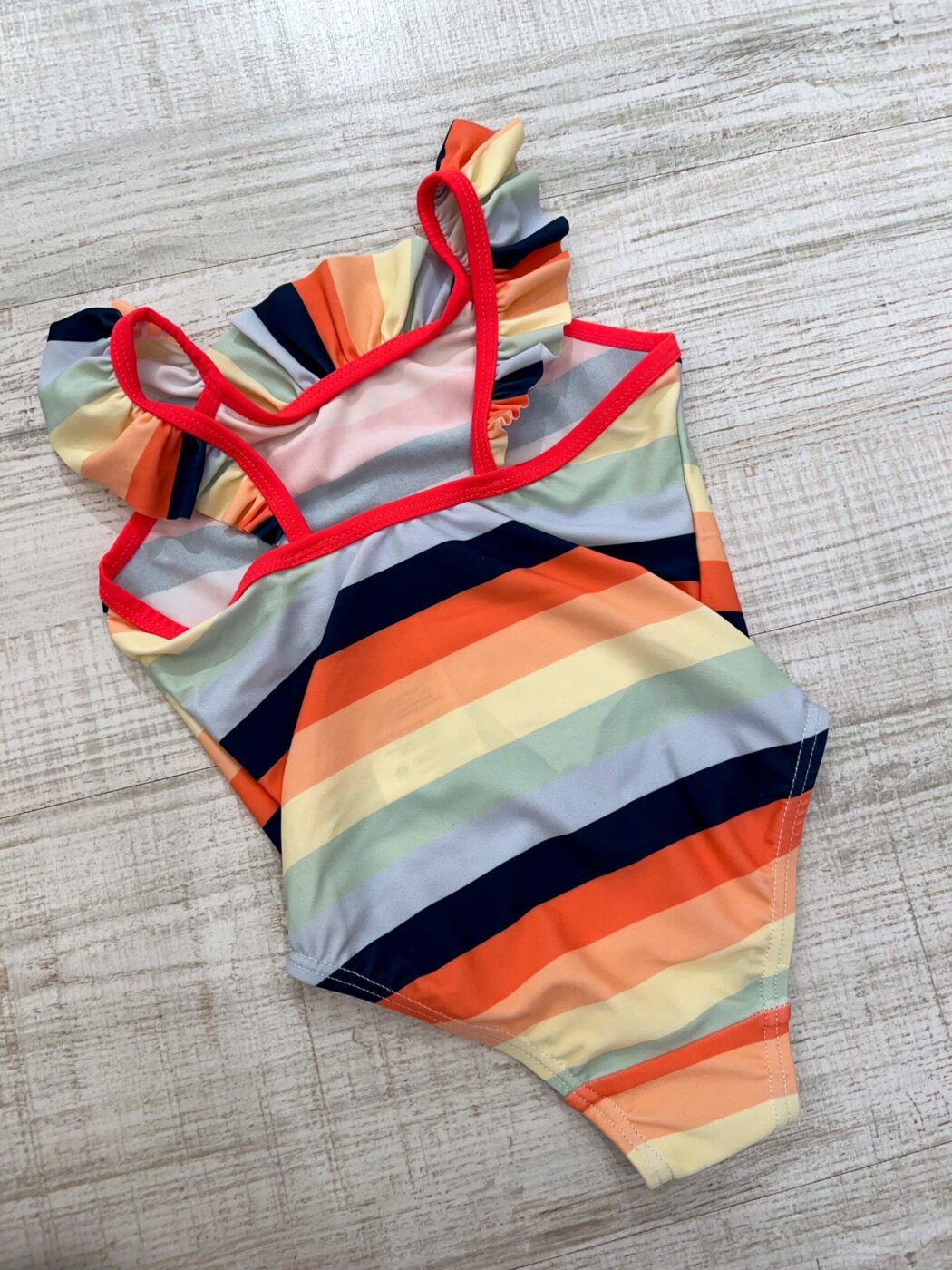 Costume intero a righe multicolore con rouches sul girocollo e spalline. Vestibilità slip normale ed elasticizzato.