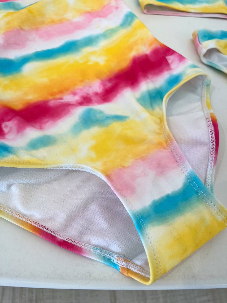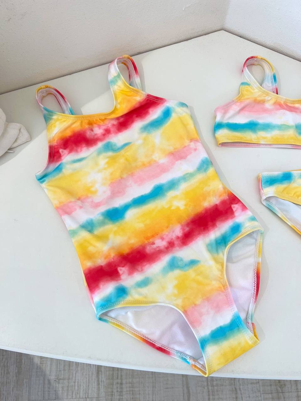 Costume intero colorato sfumato giallo, azzurro e rosa, spalline larghe e scollo rotondo. Vestibilità regolare.