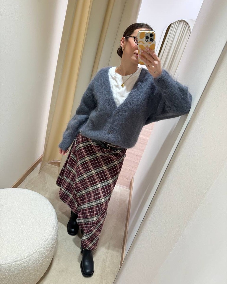 Un look dal fascino casual-chic che unisce comfort e stile senza tempo. Il cardigan morbido color grigio, dalla linea rilassata e avvolgente, è abbinato a una t-shirt bianca essenziale per un effetto pulito e luminoso. La gonna midi in fantasia tartan nei toni del borgogna dona carattere e movimento, creando un equilibrio perfetto tra femminilità e praticità. Completano l’outfit stivaletti neri dal design minimal, ideali per un look quotidiano curato e versatile.