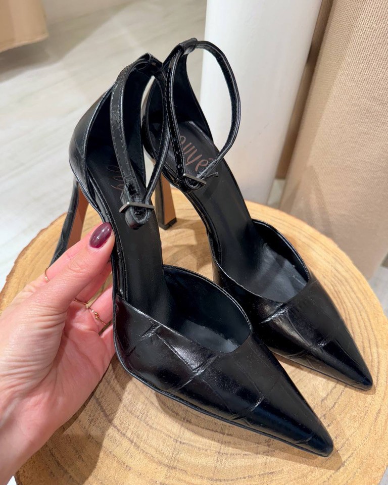 Decolletè nere cocco in vera pelle made in Italy, modello con punta allungata, chiusura con cinturino regolabile e tacco alto circa 9 cm. Calzata regolare.