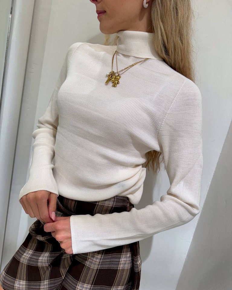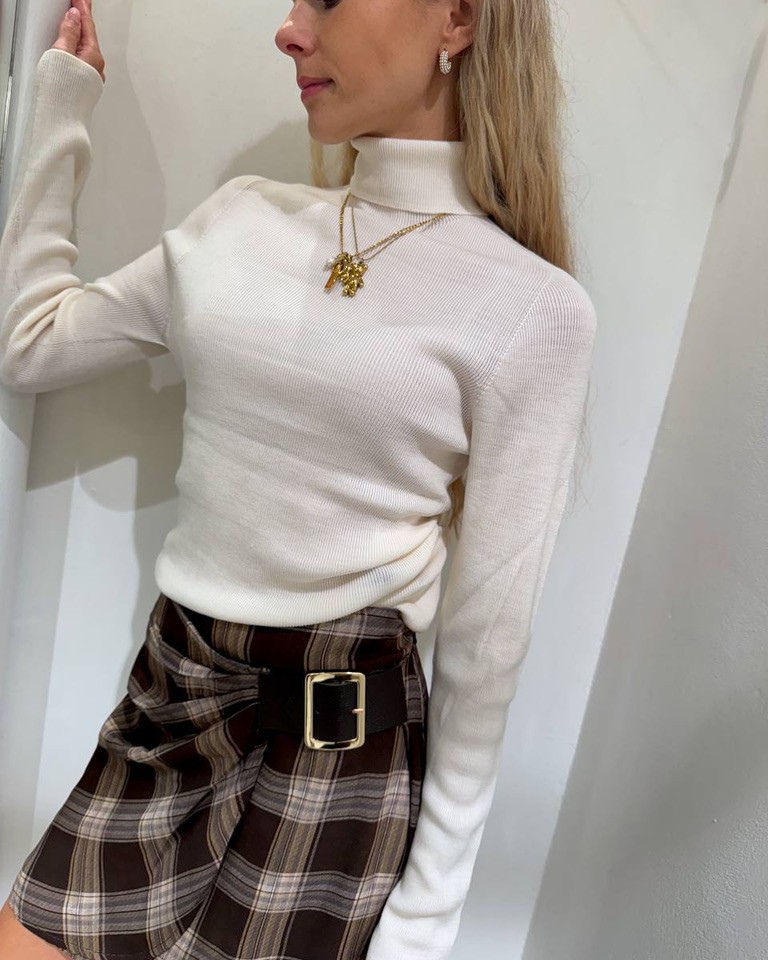 Dolcevita burro in viscosa, modello a costine, maniche lunghe raglan e collo alto. Vestibilità aderente ed elasticizzata.