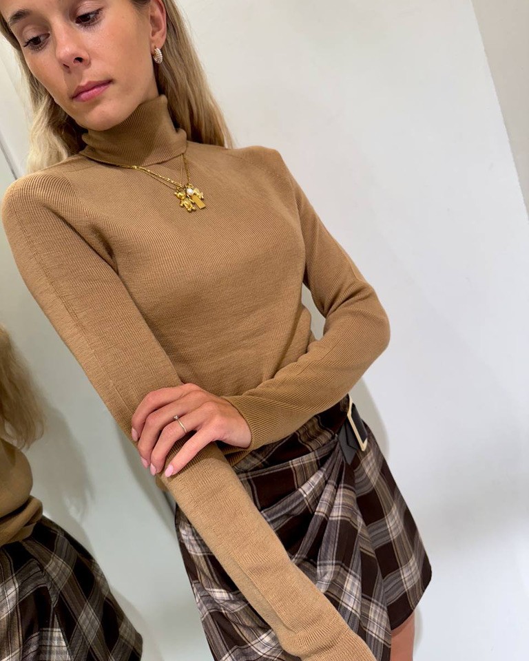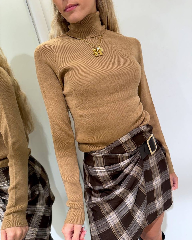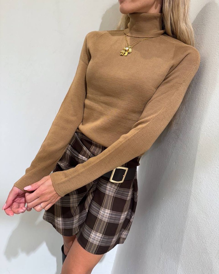 Dolcevita cammello lana merino, modello a costine, maniche lunghe raglan e collo alto. Vestibilità aderente ed elasticizzata.