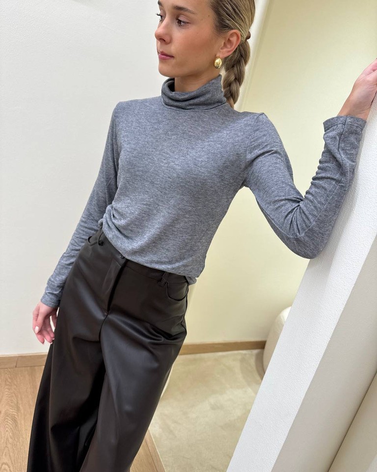 Dolcevita leggero in viscosa e lana grigio melange, modello collo alto girato con maniche lunghe. Vestibilità aderente ed elasticizzata.