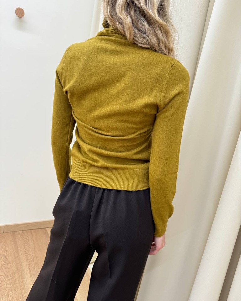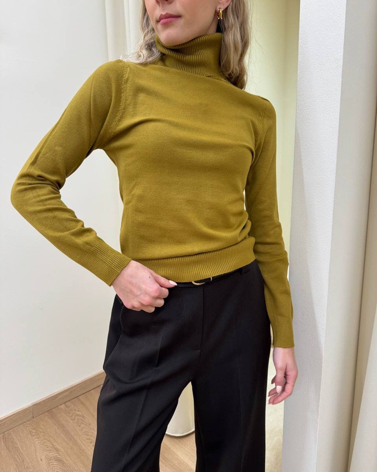 Dolcevita olio in maglia rasata con viscosa, modello a collo alto con costine, maniche lunghe, costine su polsi e fondo. Vestibilità regolare ed elasticizzata.