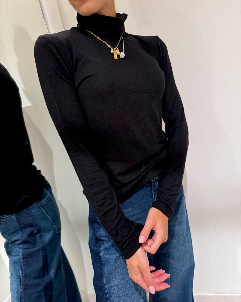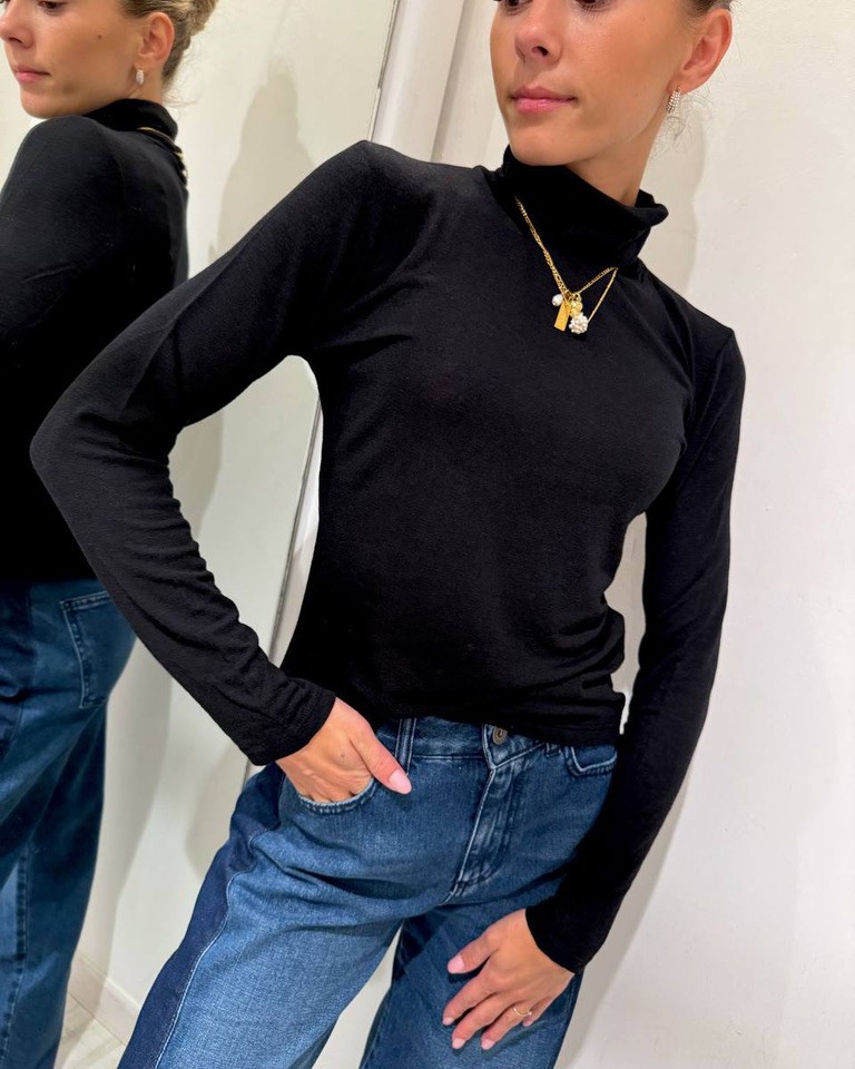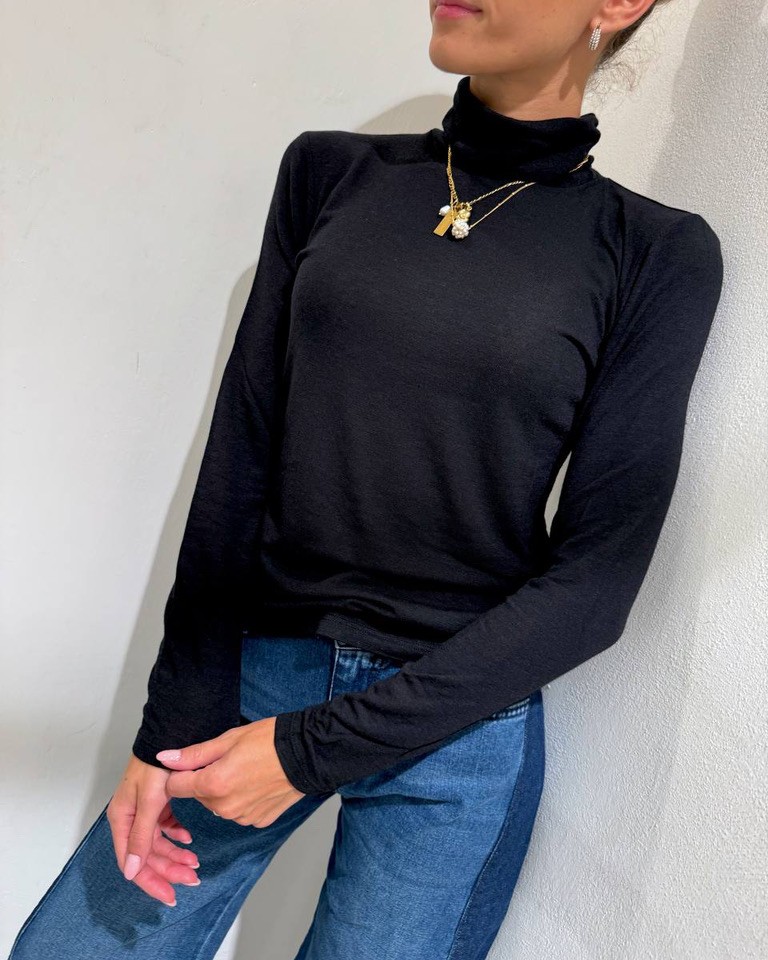 Dolcevita leggero in viscosa e lana nero, modello collo alto girato con maniche lunghe. Vestibilità aderente ed elasticizzata.
