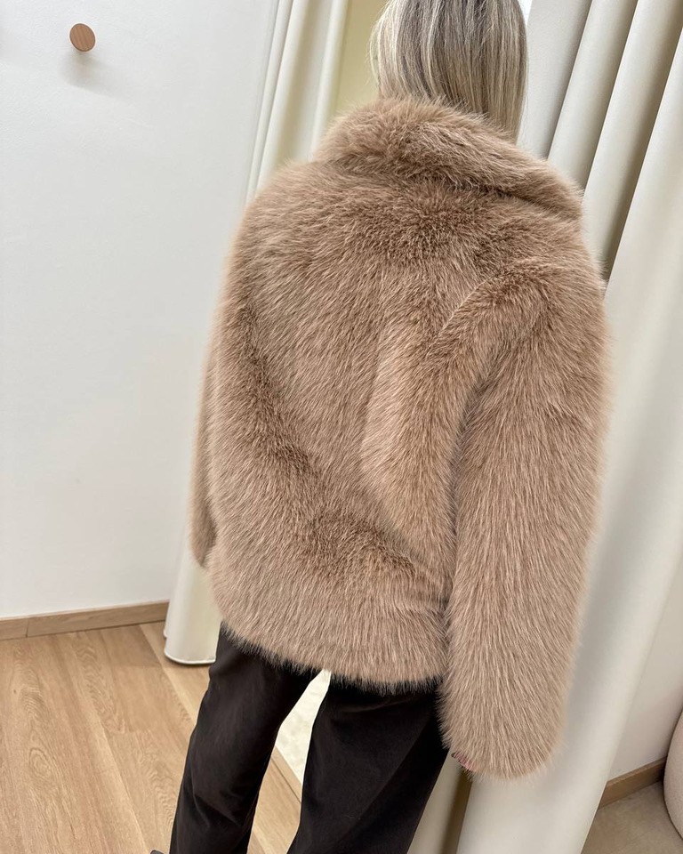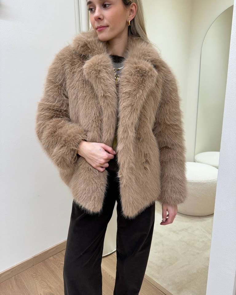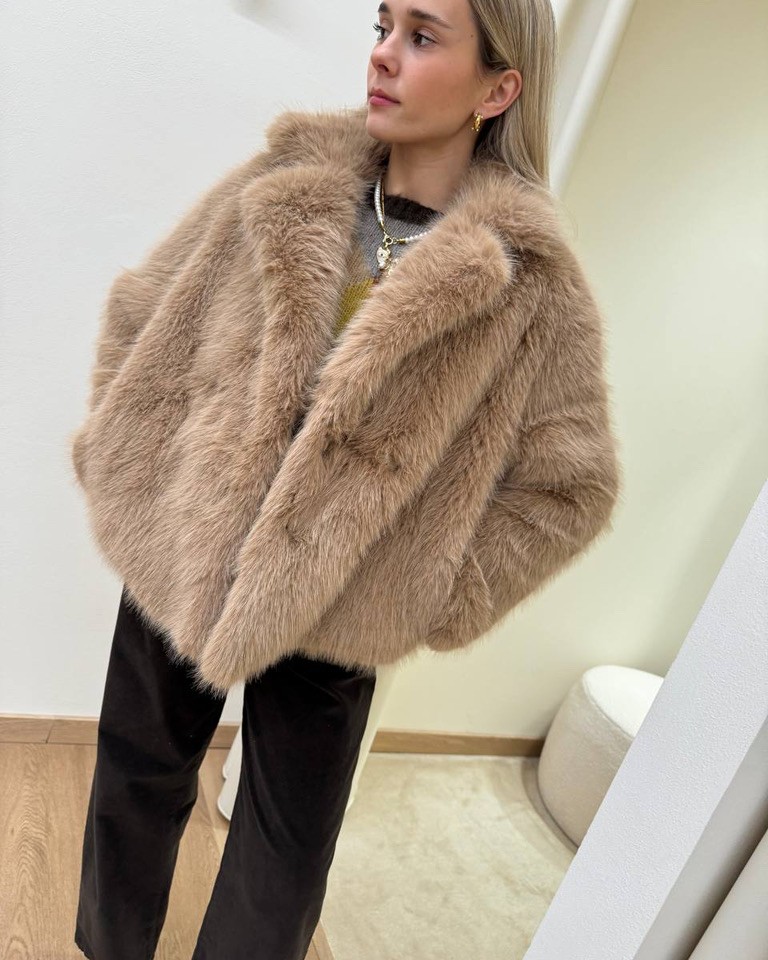 Eco pelliccia color cammello foderata all’interno, modello doppiopetto corto con maniche lunghe, tasche laterali e rever, chiusura frontale con bottoni automatici. Vestibilità dritta.
