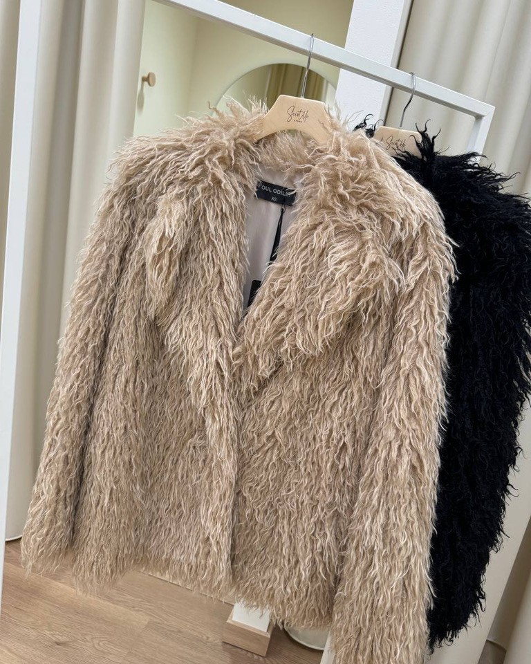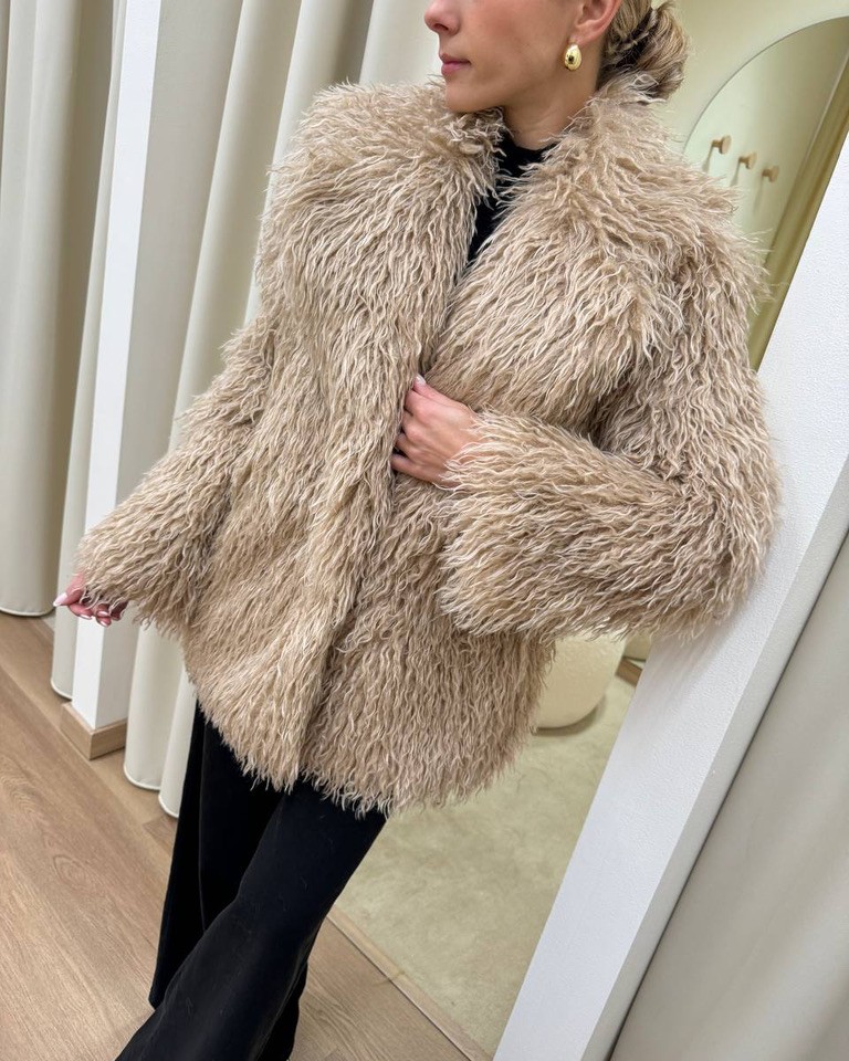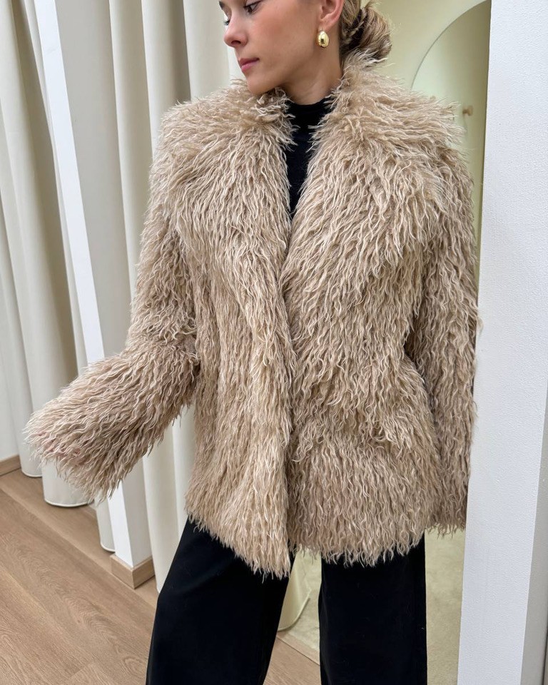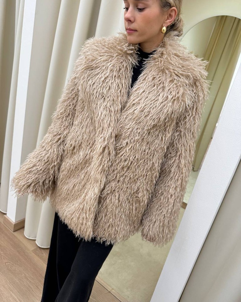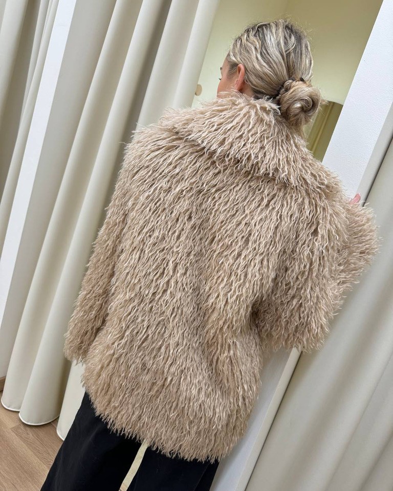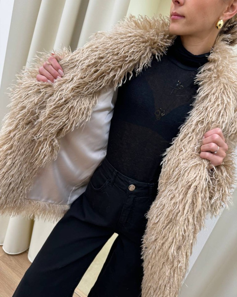 Eco pelliccia Lea effetto mongolia color beige foderata all’interno, modello maniche lunghe con maxi collo a revers e chiusura frontale con bottone. Vestibilità dritta e regolare.