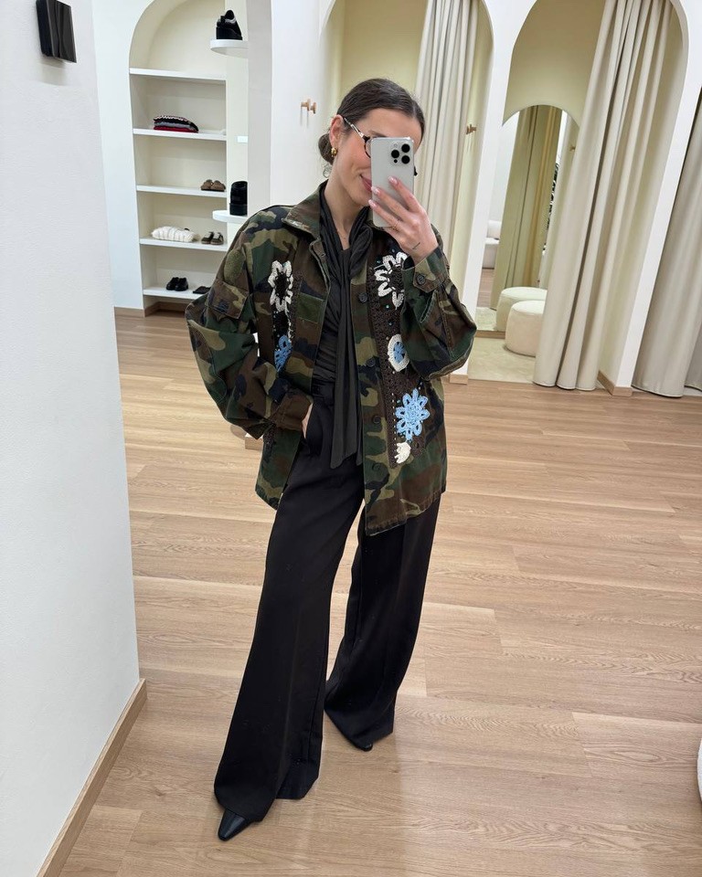 Un outfit dallo spirito audace e contemporaneo. La giacca camouflage, impreziosita da ricami all’ uncinetto decorativi, diventa protagonista del look, abbinata a pantaloni moro dal taglio fluido. Un mix equilibrato tra grinta e raffinatezza, perfetto per chi ama distinguersi con uno stile originale e di tendenza.