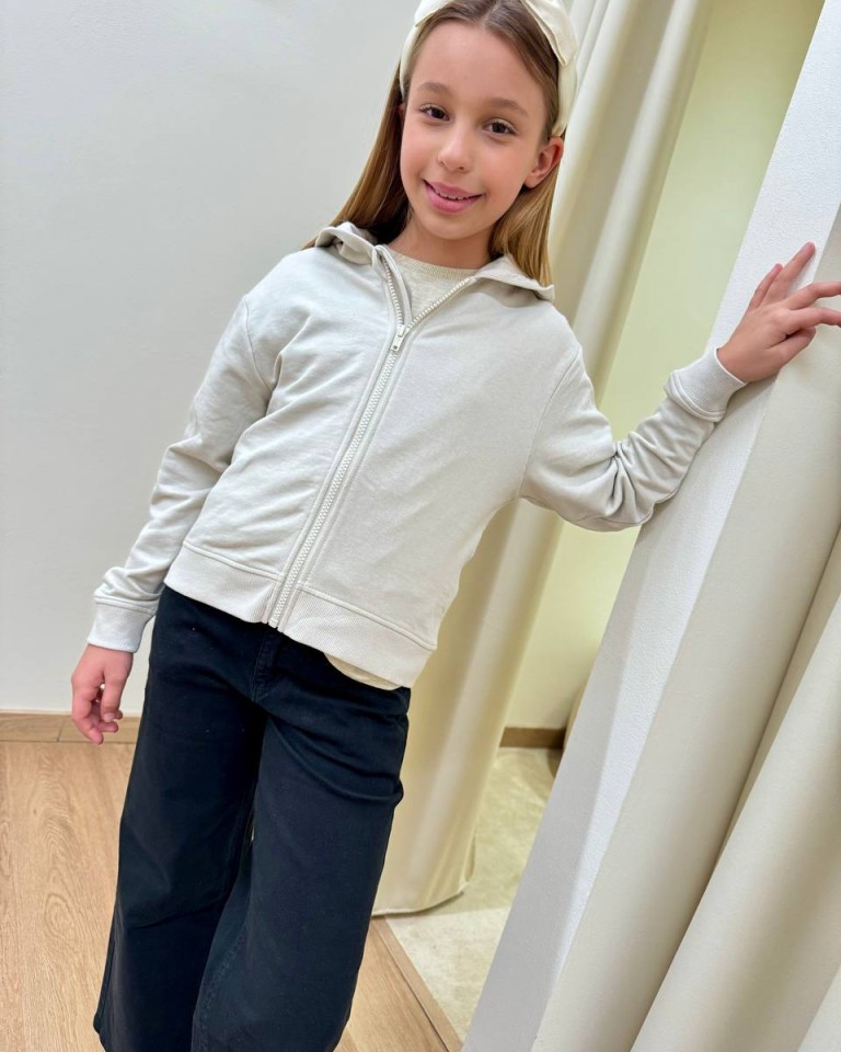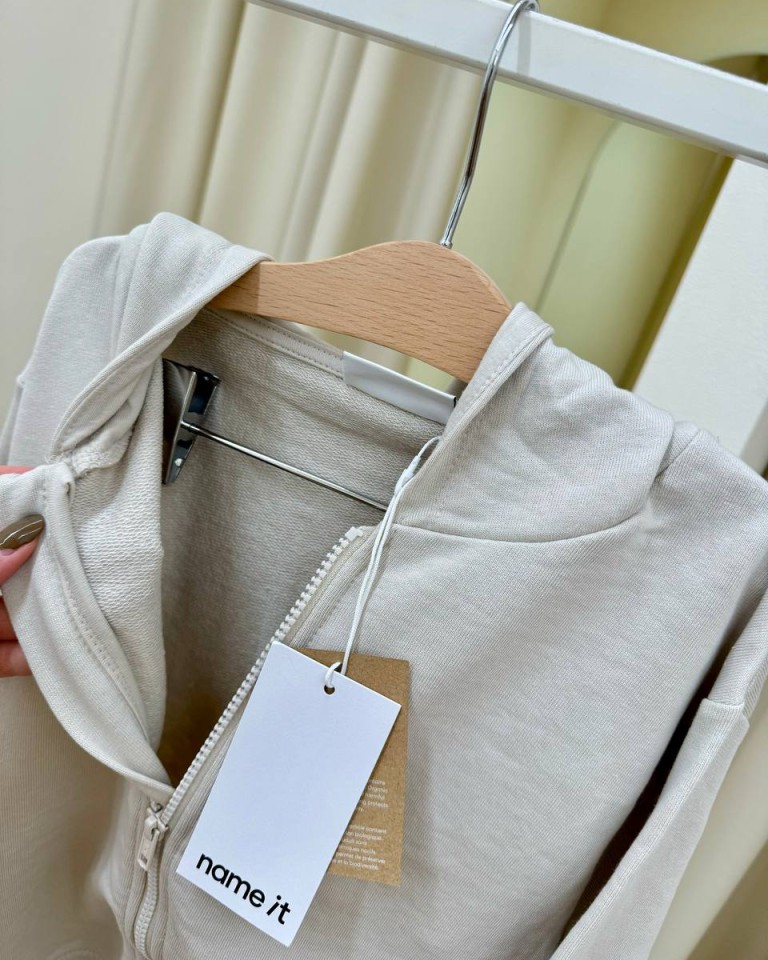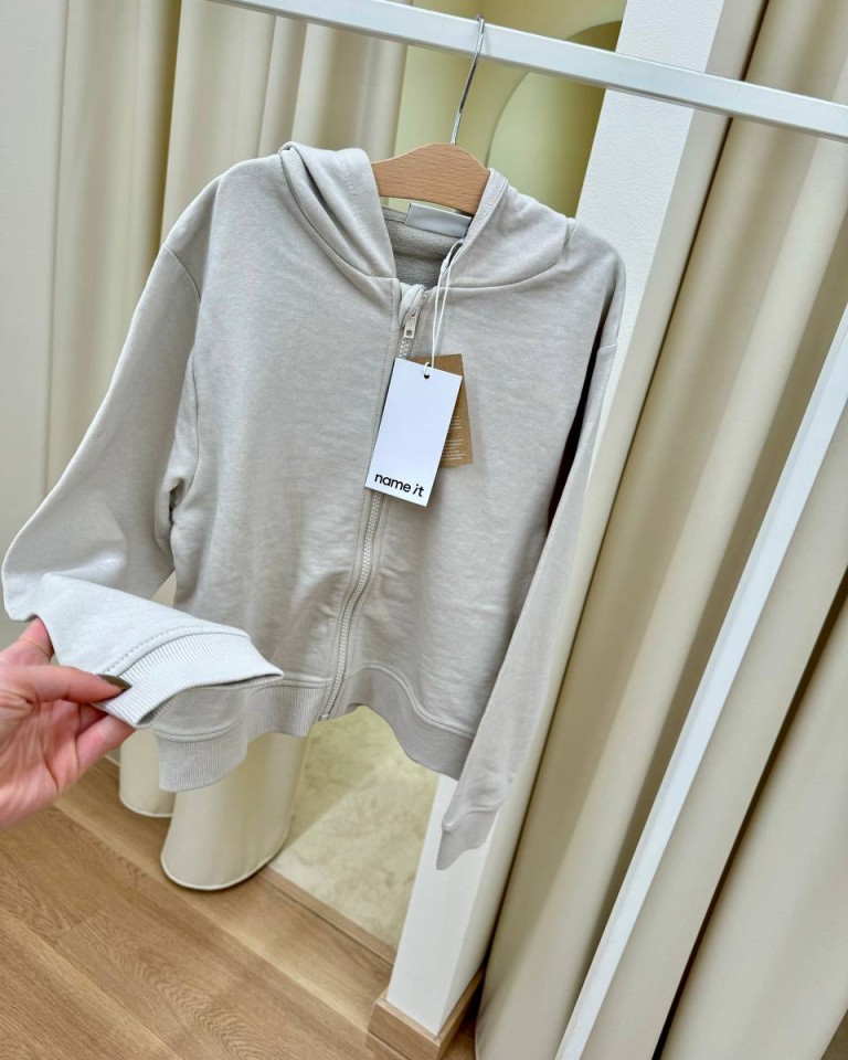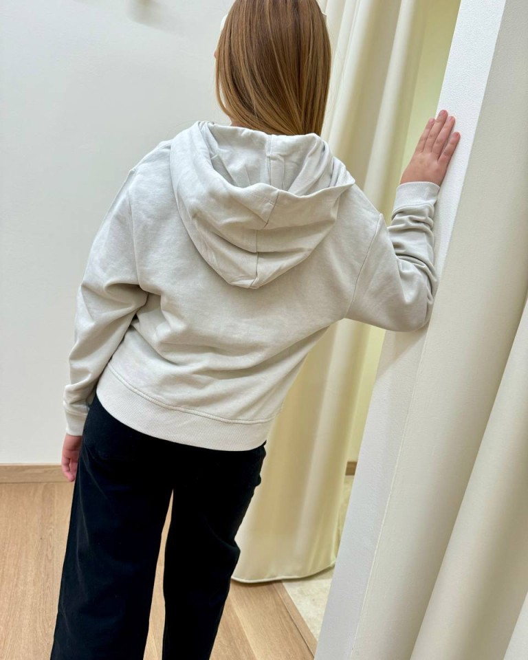 Felpa color sabbia, modello basic con cappuccio, maniche lunghe, chiusura con zip davanti, fondo e polsi a costine. Vestibilità regolare.
