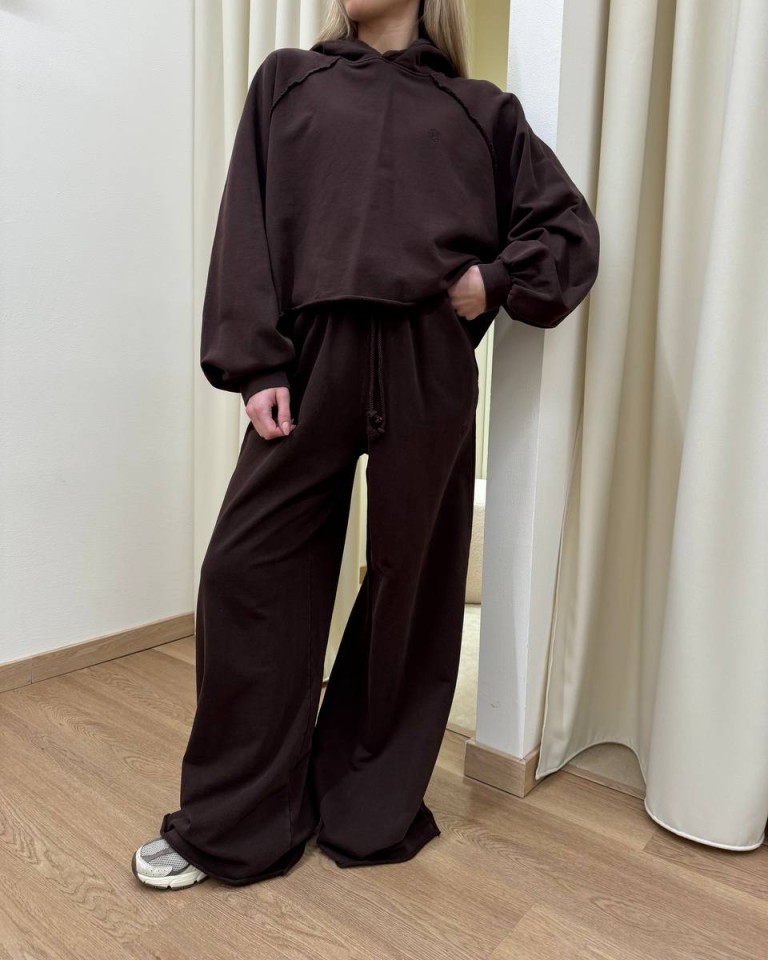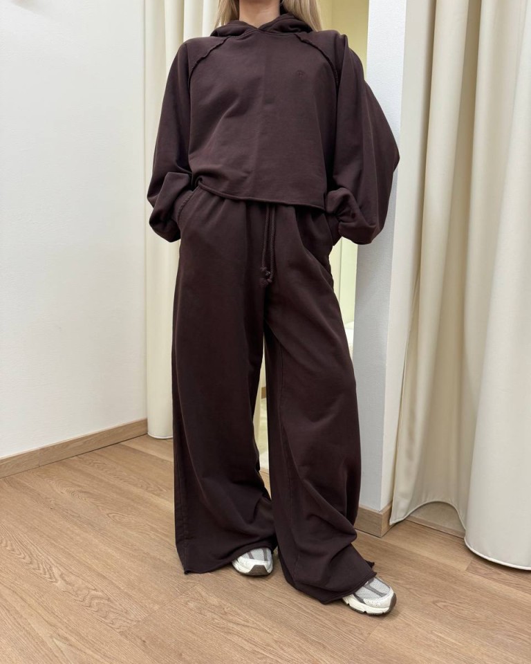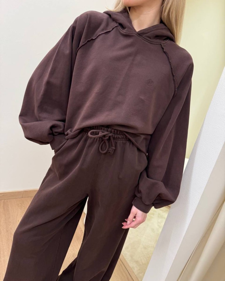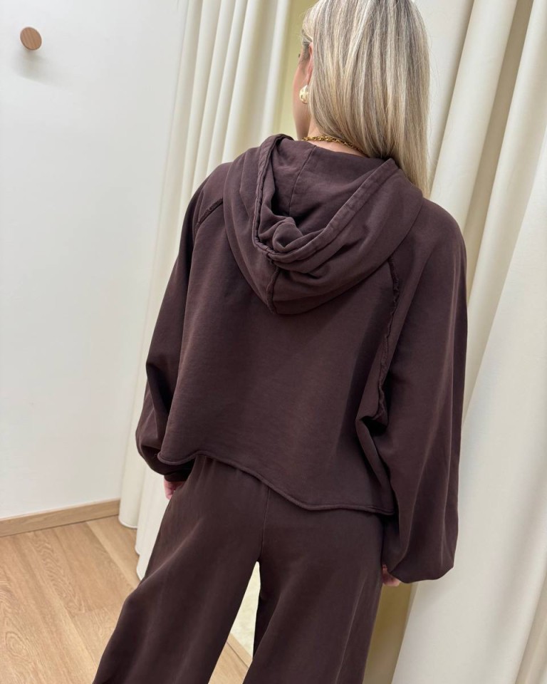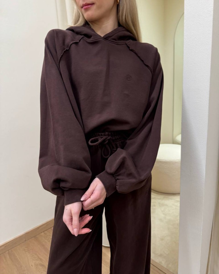 Felpa color moro, modello crop con cappuccio, manica raglan lunga con polsini aderenti, logo ricamato sul davanti. Vestibilità ampia.