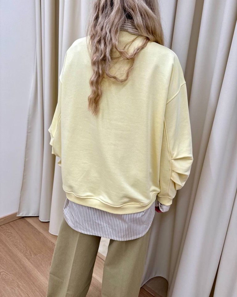 Felpa garzata giallo pastello con scritta stampata “I am on a champagne diet” color rosa chiaro, modello over, girocollo, davanti più corto del dietro, giro sceso emanica lunga con arricciatura dietro, orlo, scollo e polsi a costine. Vestibilità ampia.