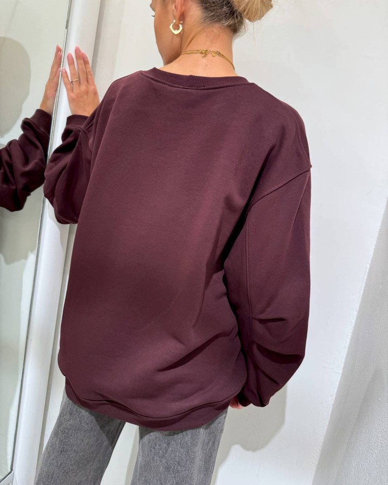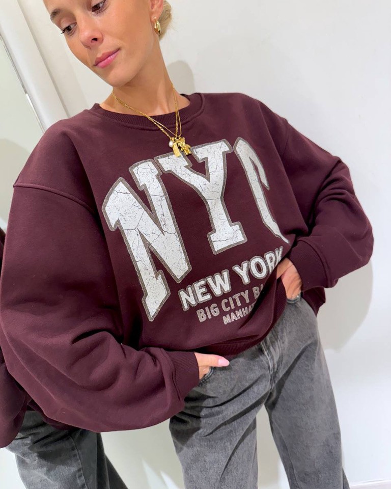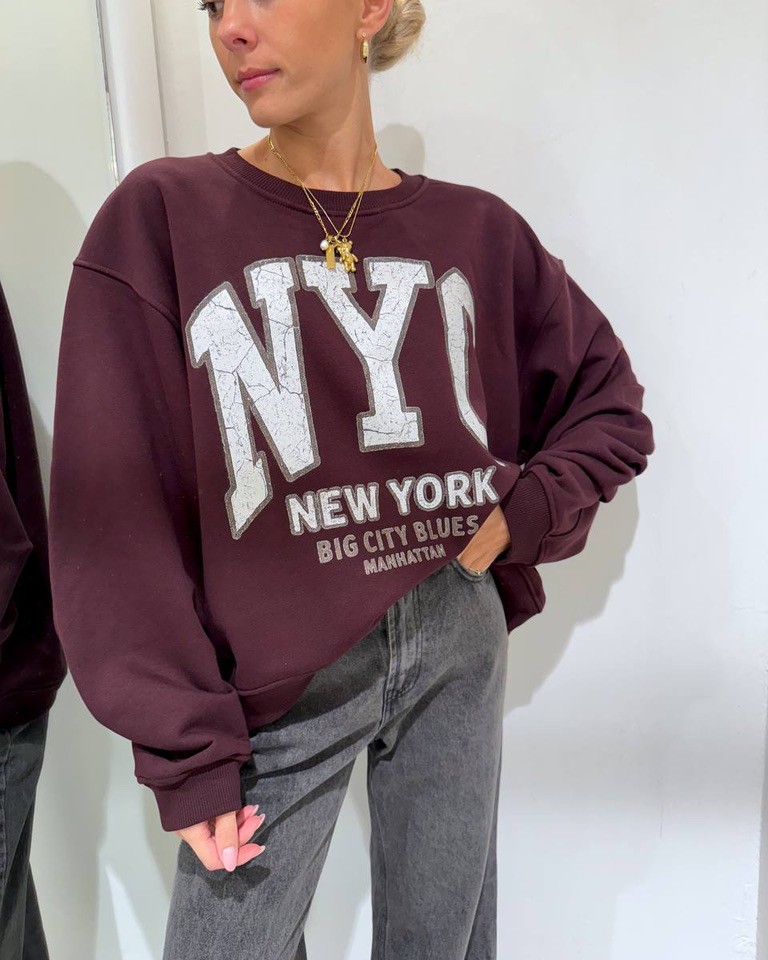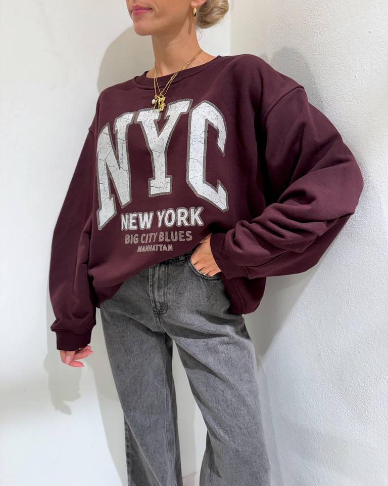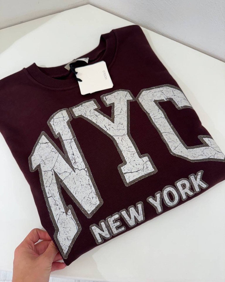 Felpa girocollo color bordeaux con stampa NYC in cotone garzato. Modello oversize, maniche lunghe scese rapprese, con fondo stondato e dietro più lungo. Polsi, fondo e collo a coste elasticizzato.