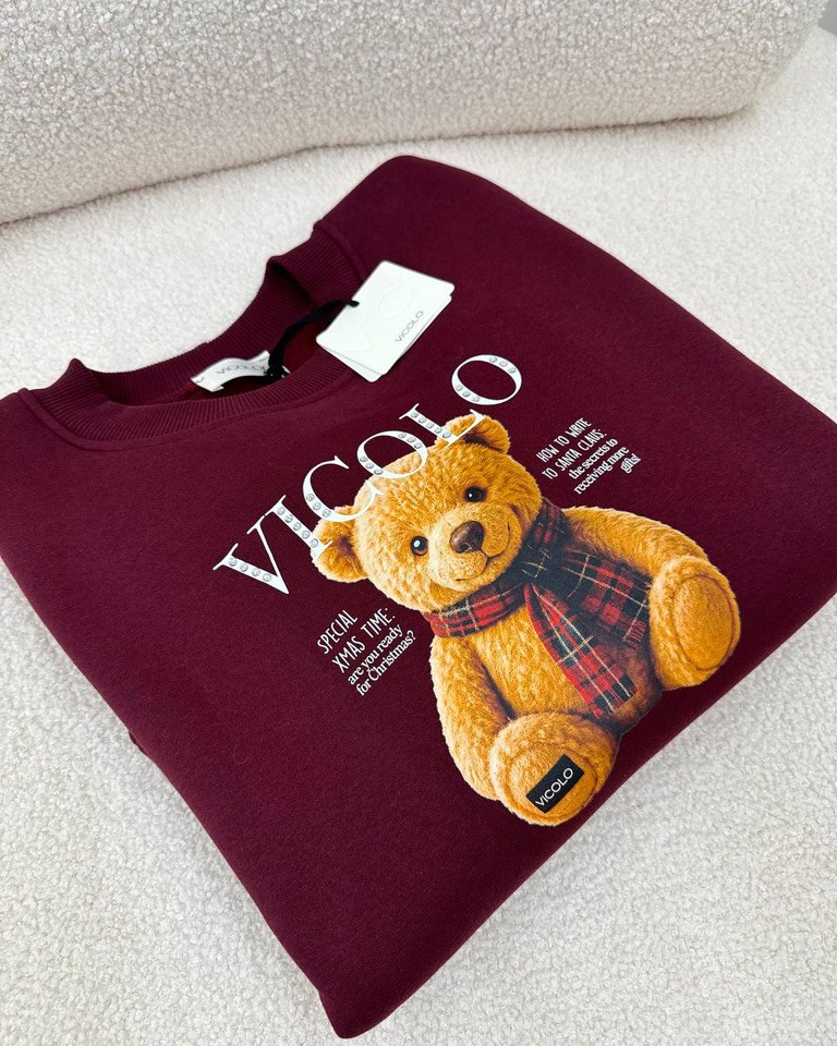Felpa bordeaux con stampa orsetto natalizio con sciarpa e logo in cotone felpato. Modello oversize, girocollo, maniche lunghe scese rapprese sul fondo. Il davanti è leggermente più corto del dietro. Vestibilità ampia.