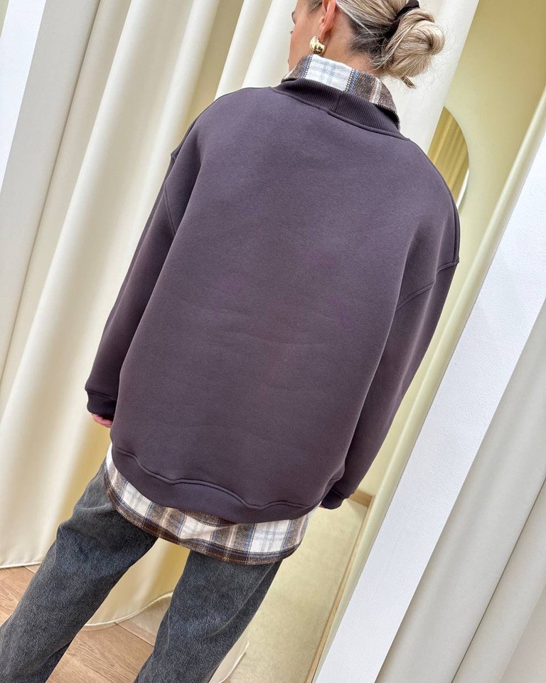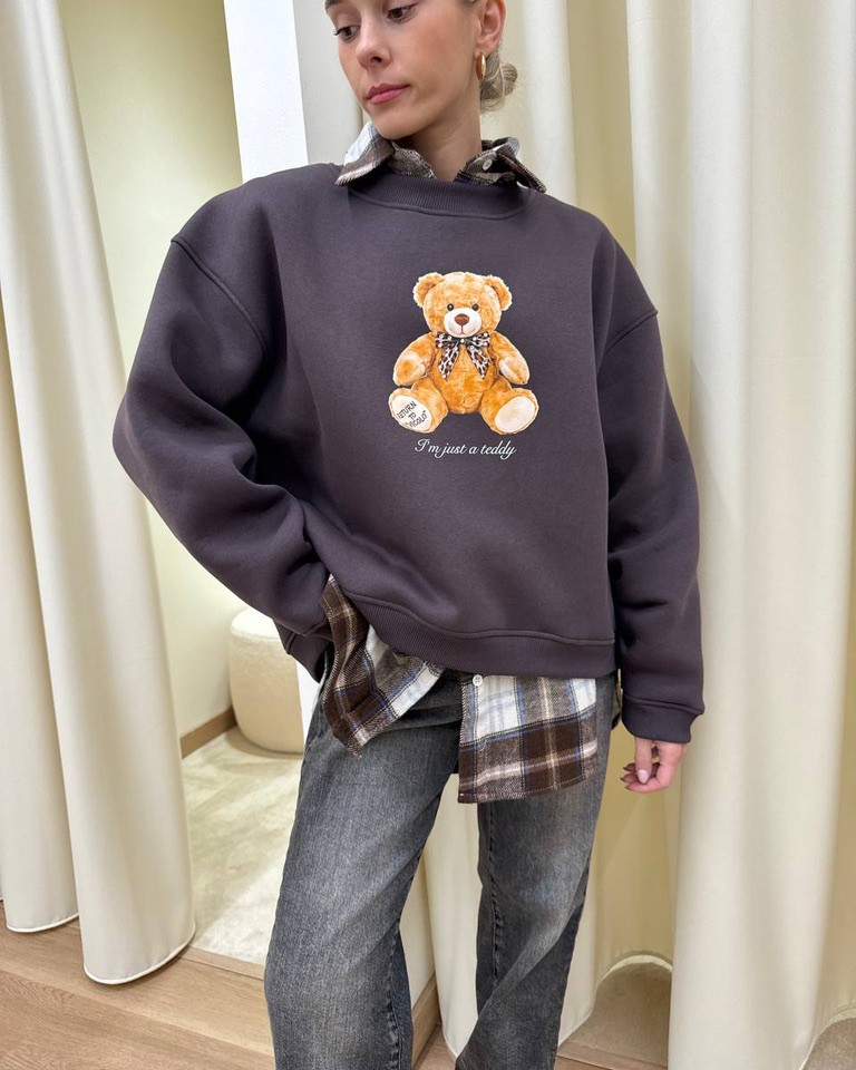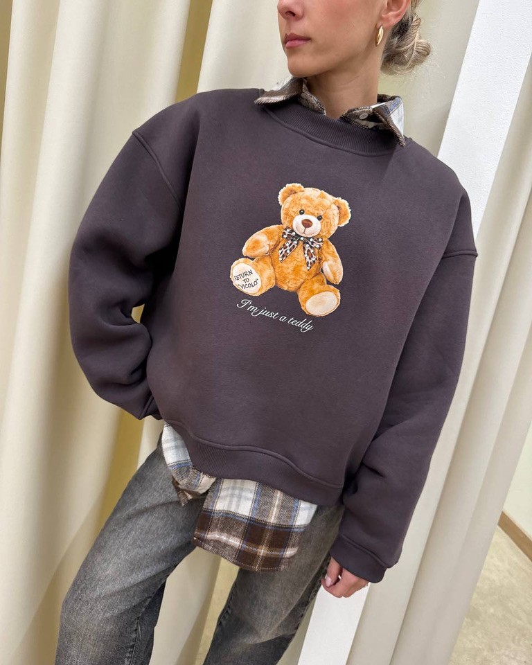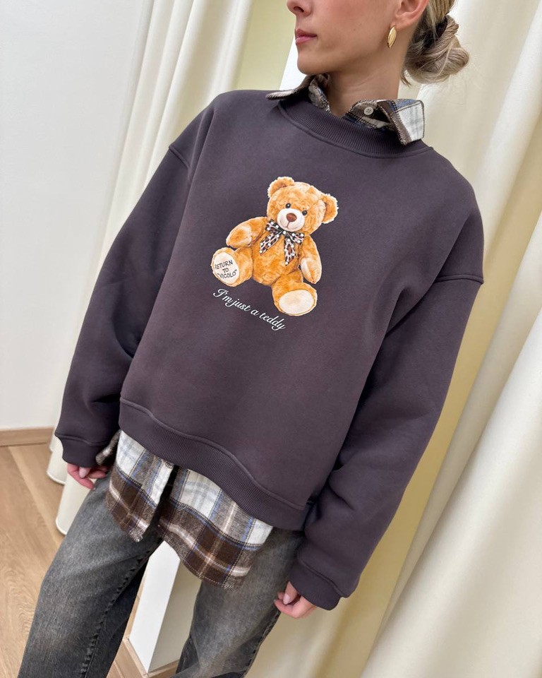 Felpa oversize girocollo color cioccolato con stampa orsetto . L’interno è felpato. Il davanti è leggermente più corto del dietro.