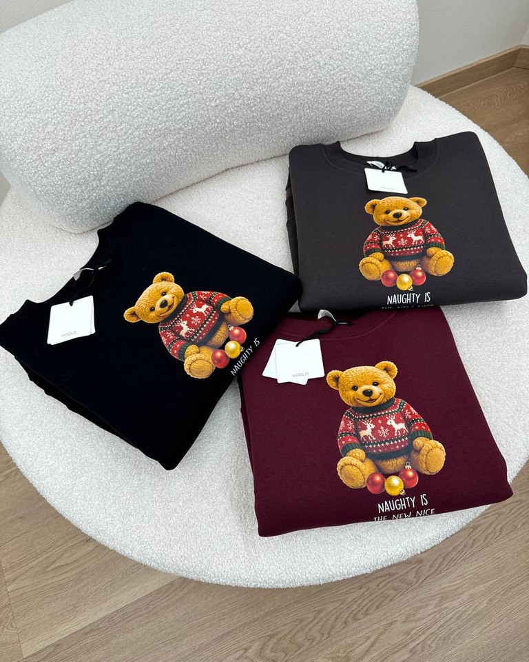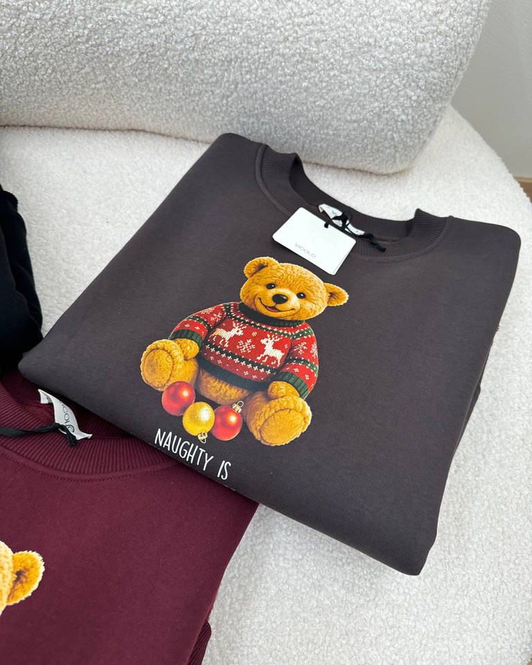 Felpa moro con stampa orsetto natalizio e scritta “Naughty is the new nice” in cotone felpato. Modello oversize, girocollo, maniche lunghe scese rapprese sul fondo. Il davanti è leggermente più corto del dietro. Vestibilità ampia.