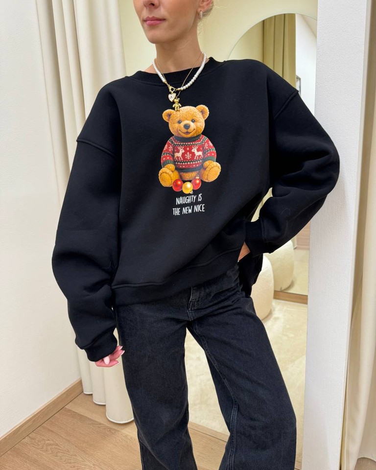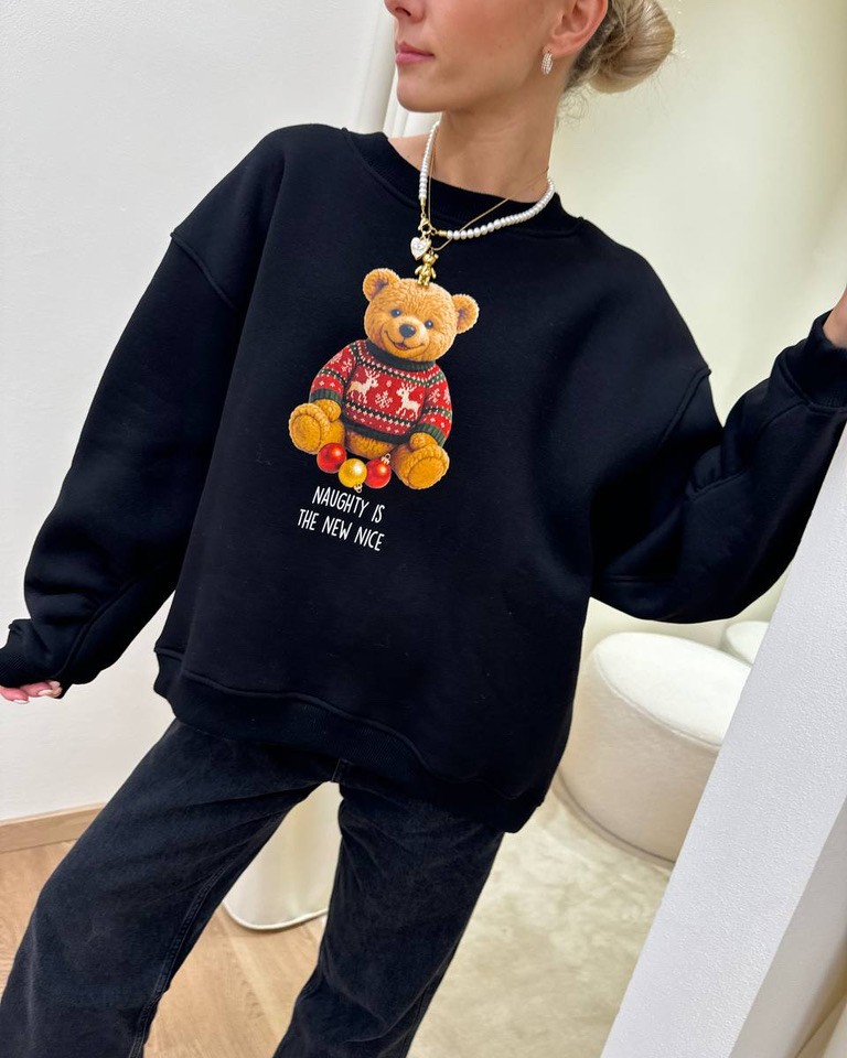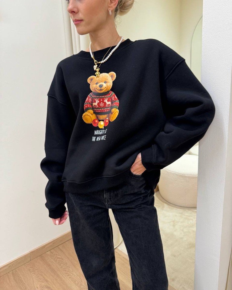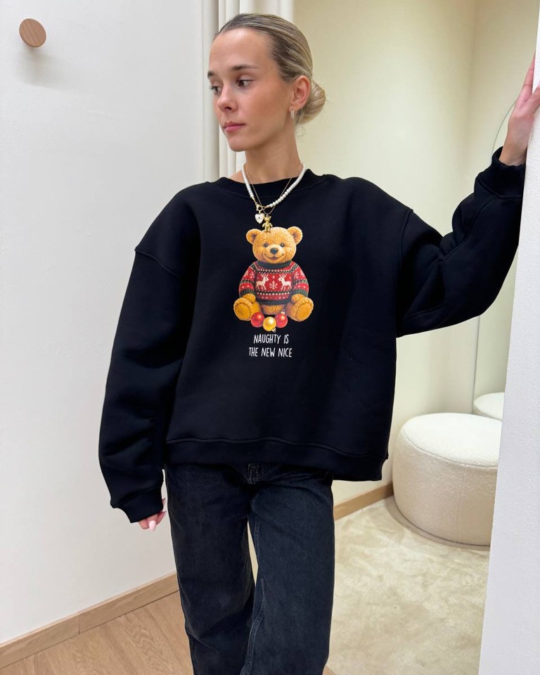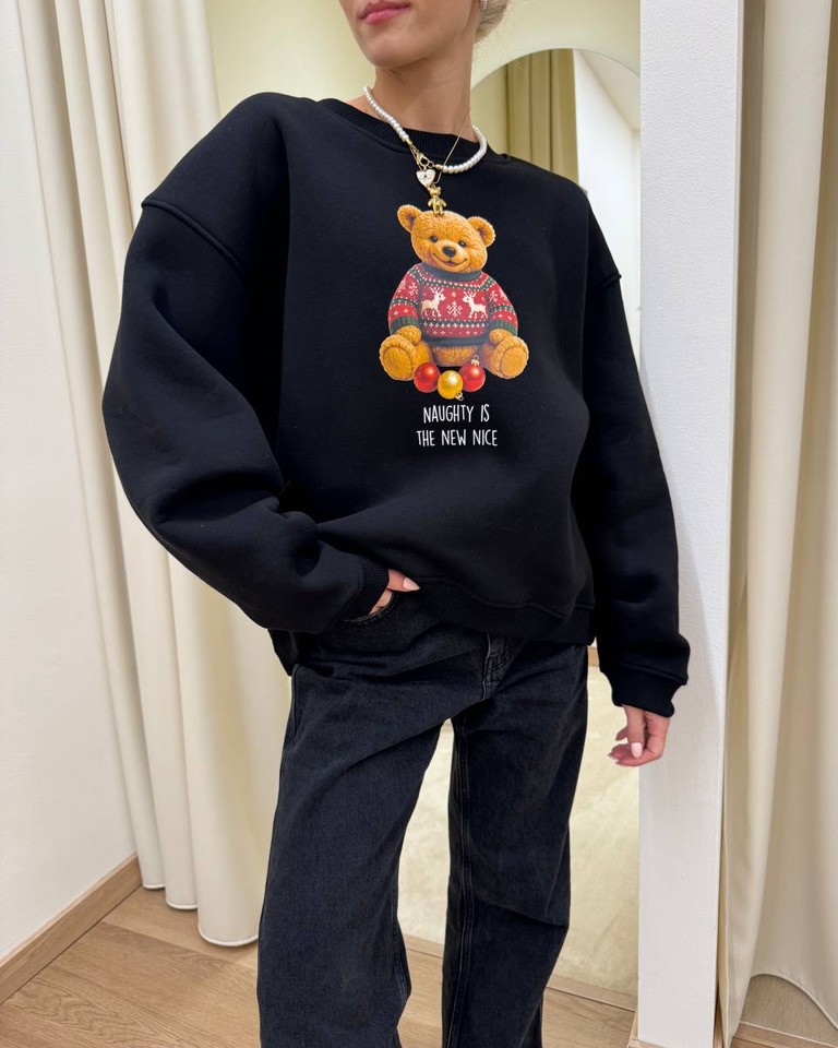 Felpa nera con stampa orsetto natalizio e scritta “Naughty is the new nice” in cotone felpato. Modello oversize, girocollo, maniche lunghe scese rapprese sul fondo. Il davanti è leggermente più corto del dietro. Vestibilità ampia.