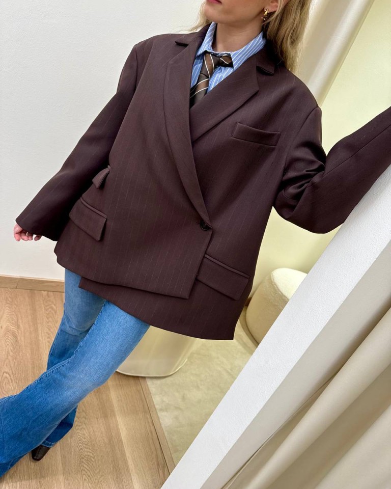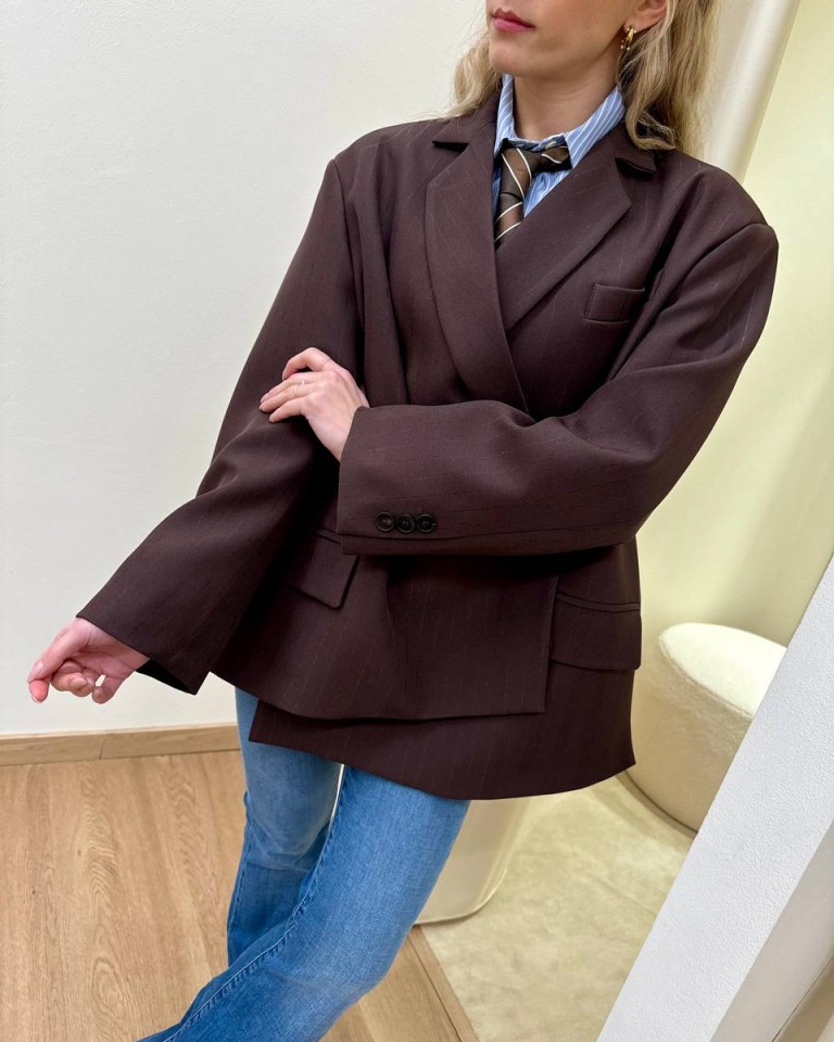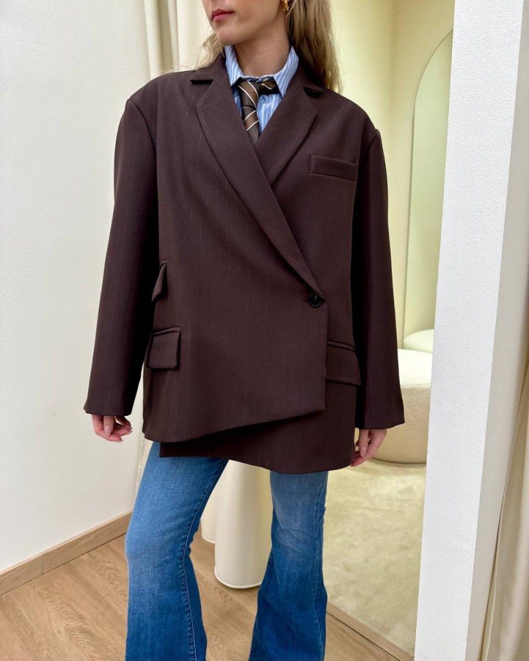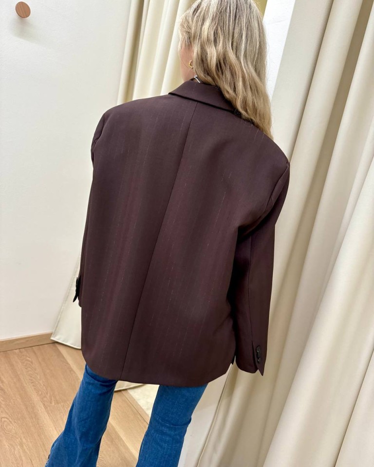 Giacca moro gessata lurex in tono, modello over, doppiopetto asimmetrico con un bottone, rever classico, spacchi laterali, tre tasche con patta e taschino sul petto, maniche lunghe con bottoni. Foderata. Vestibilità ampia.