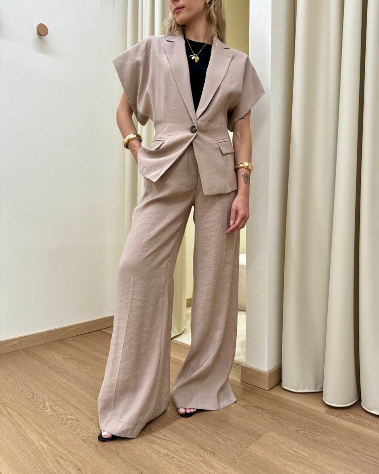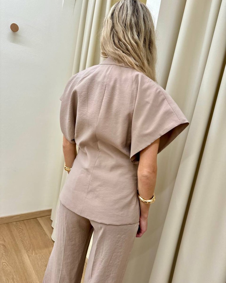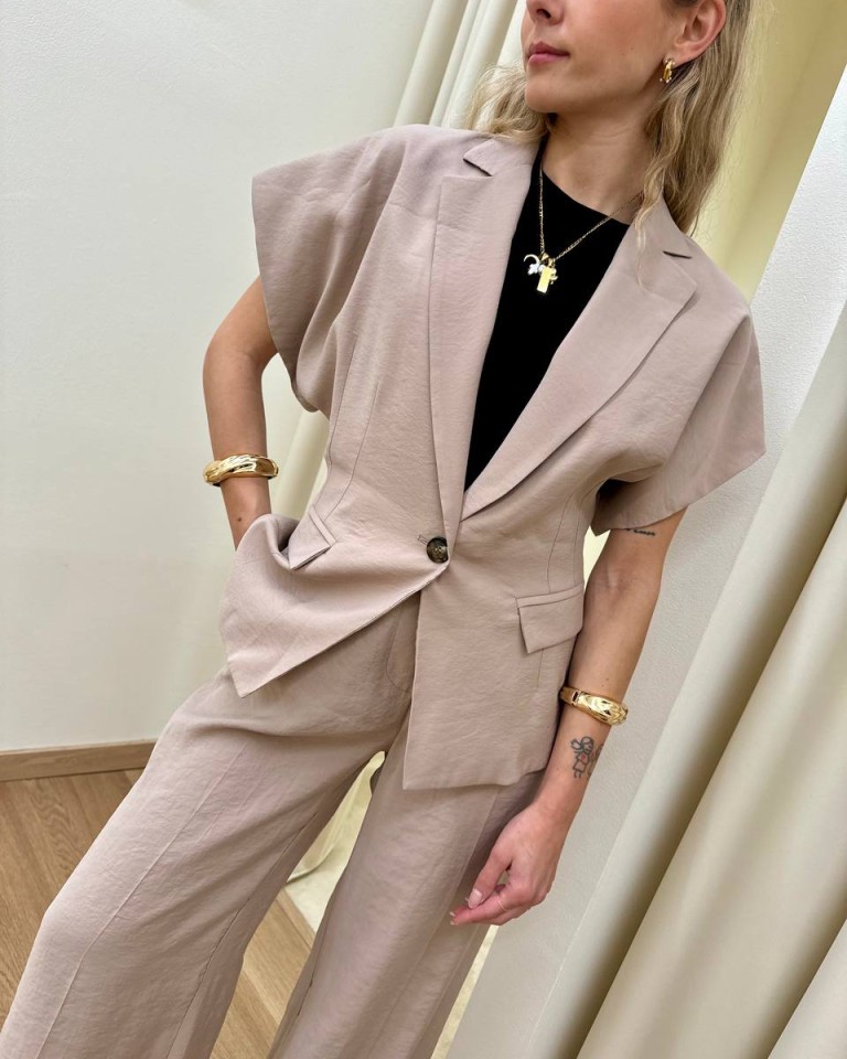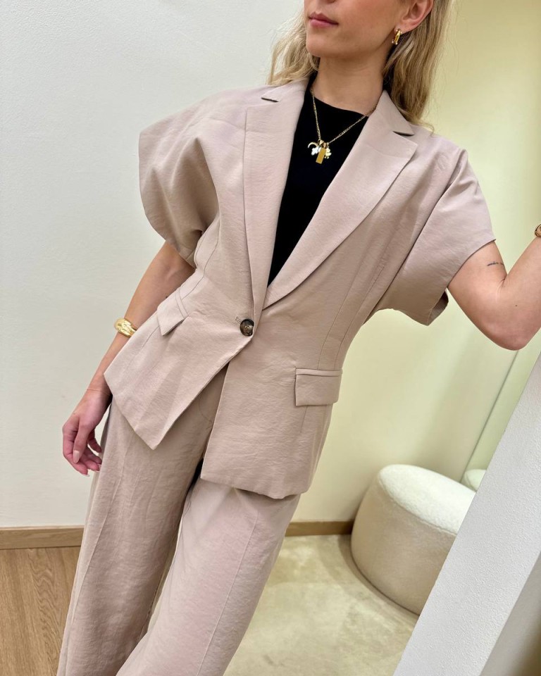 Giacca sabbia, modello avvitato con rever classico e chiusura ad un bottone, manica corta a kimono, tasche con pattina. Vestibilità regolare.