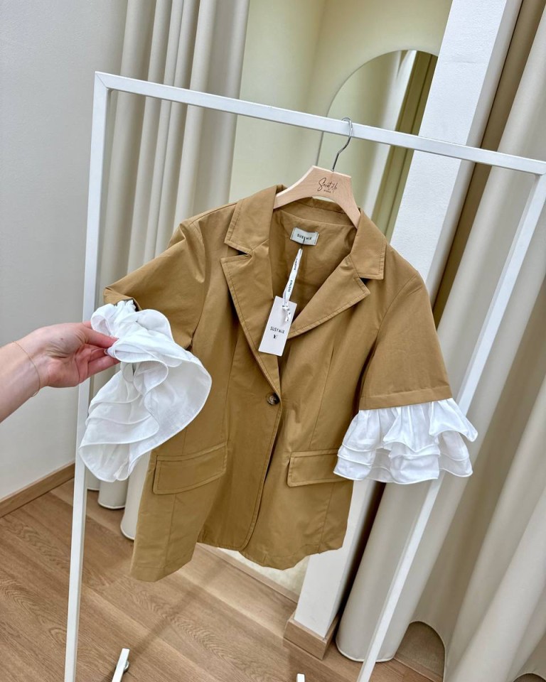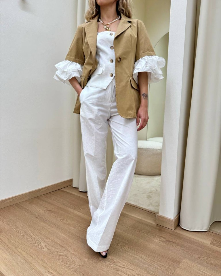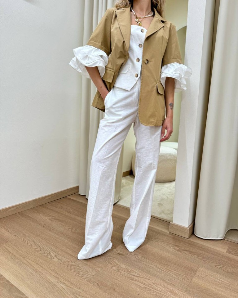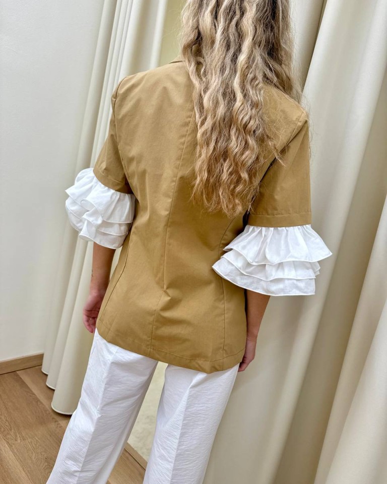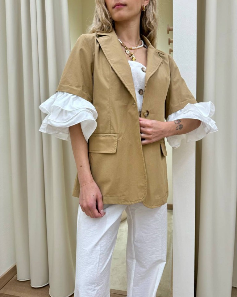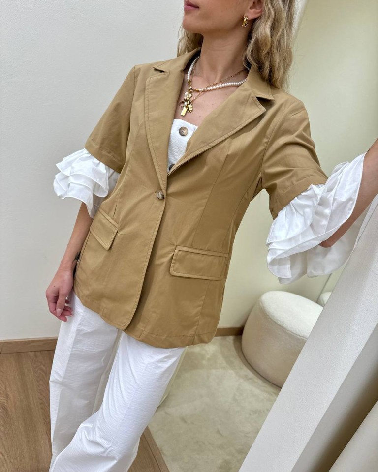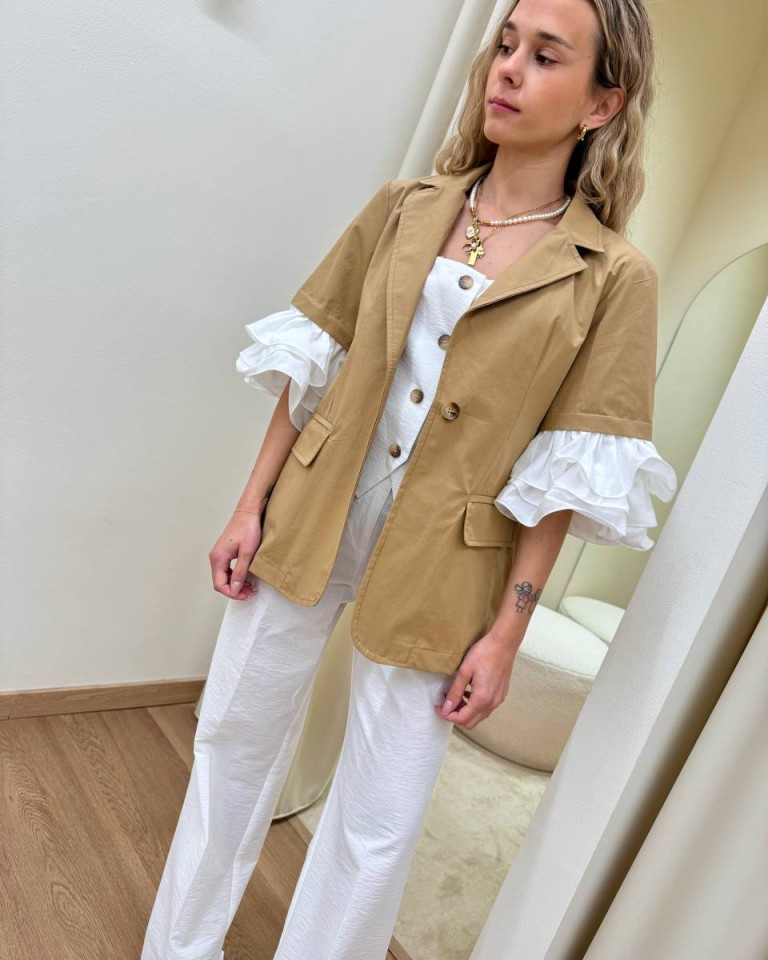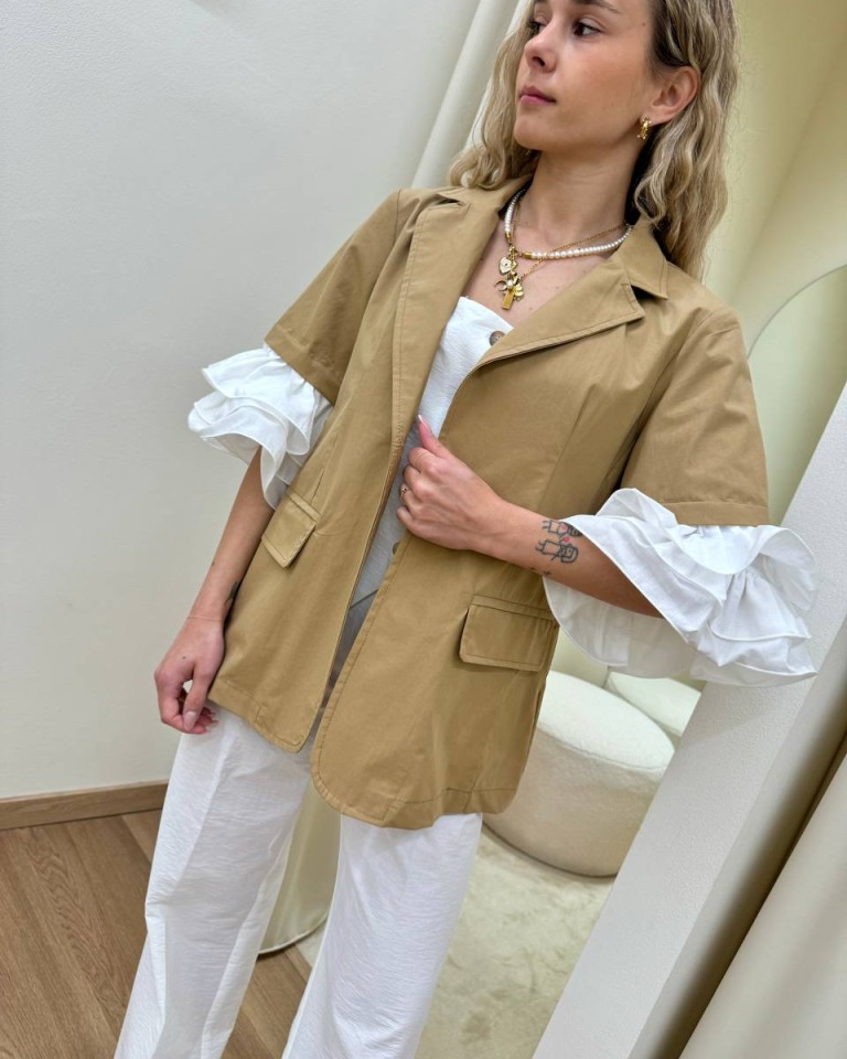 Giacca color cammello, modello dritto con rever classico, tasche con patta, maniche corte con rouches bianche a contrasto. Vestibilità ampia.