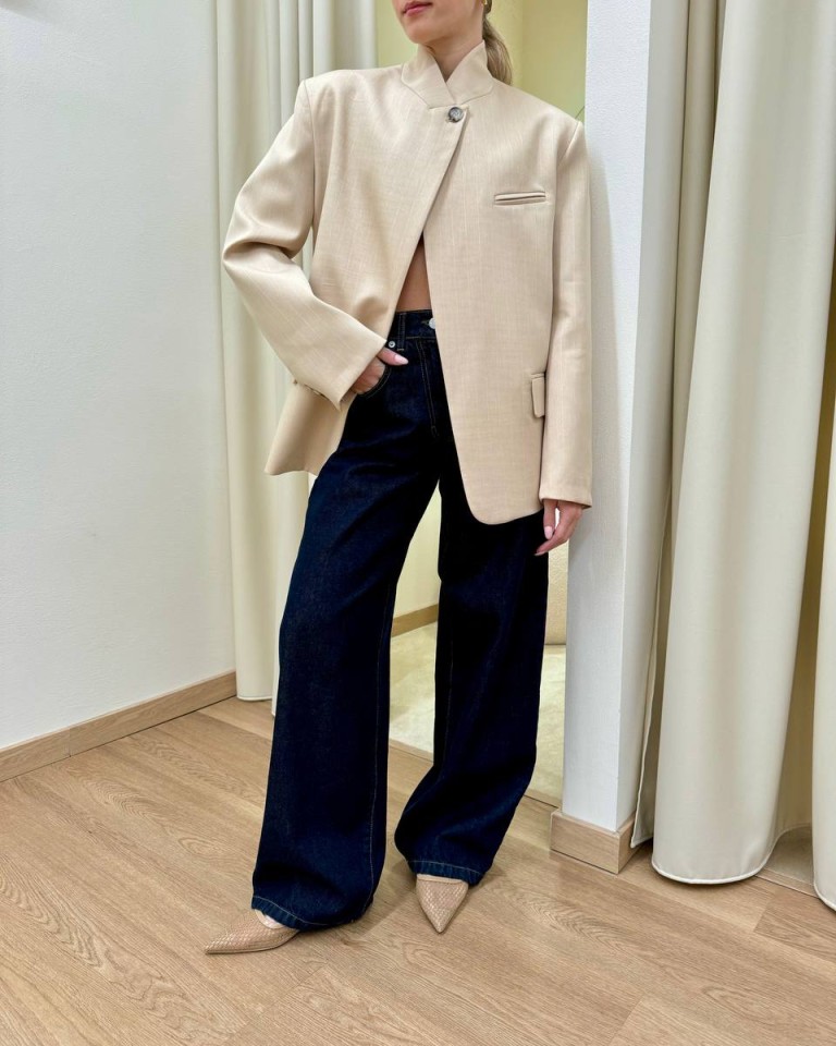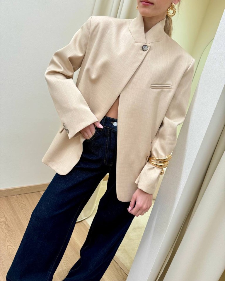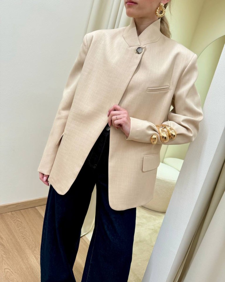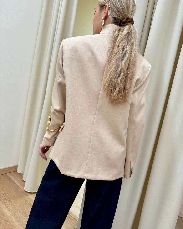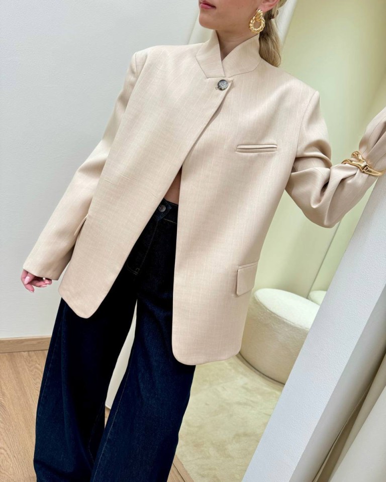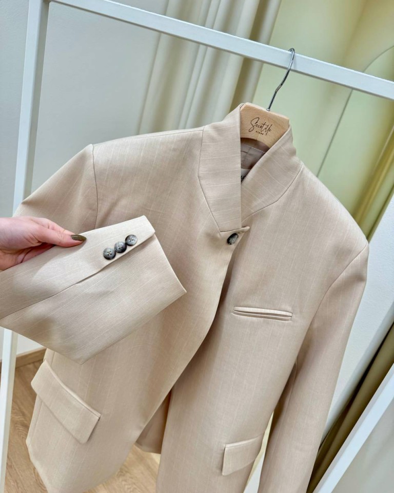 Giacca gessata beige e bianca, modello coreana con rever chiuso da un bottone, tasche con patta e taschino a filetto sul petto, manica lunga, spalline imbottite. Vestibilità regolare.