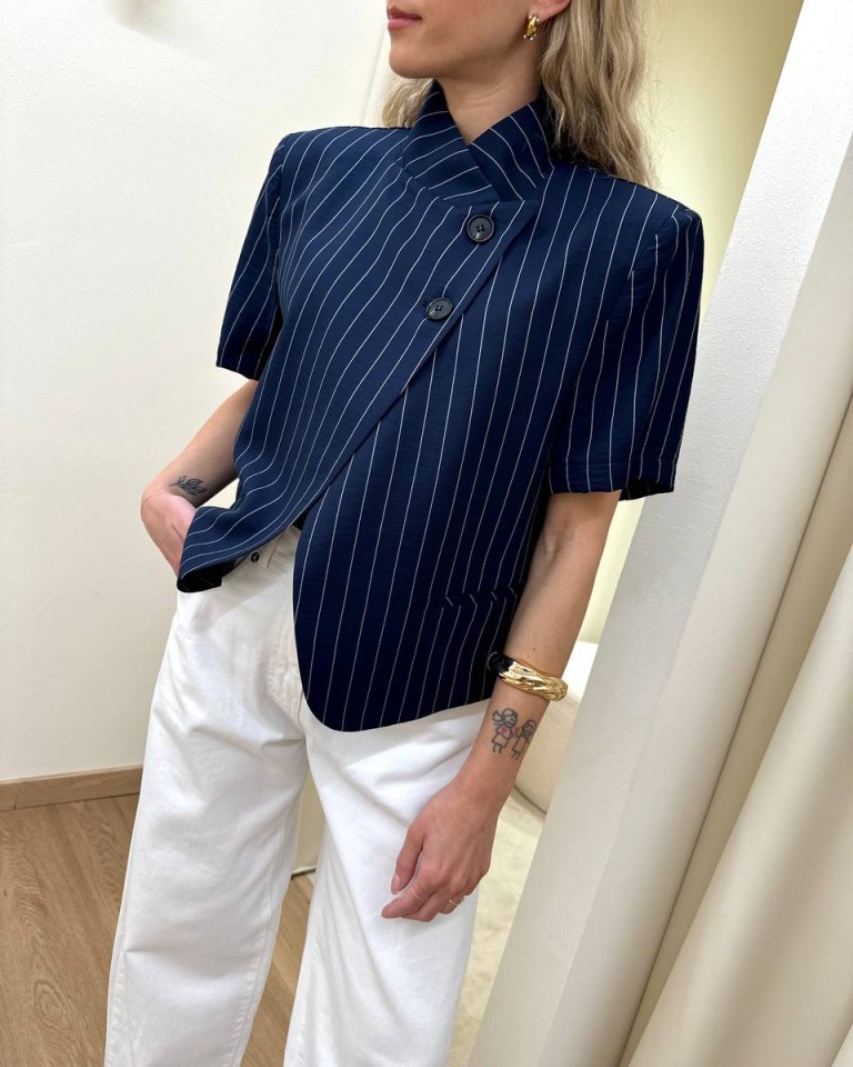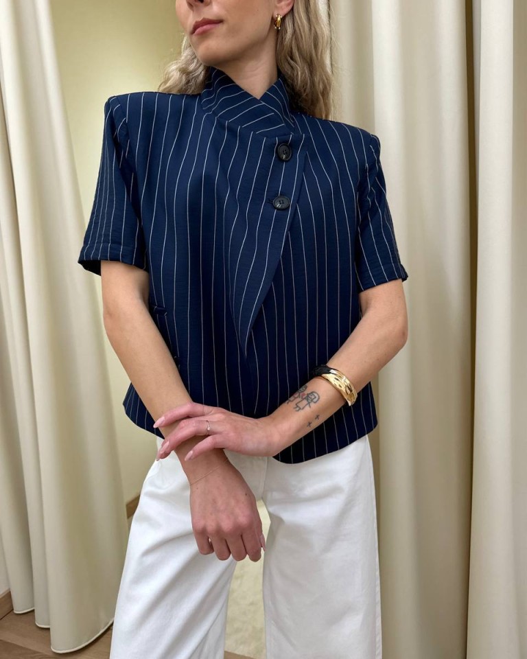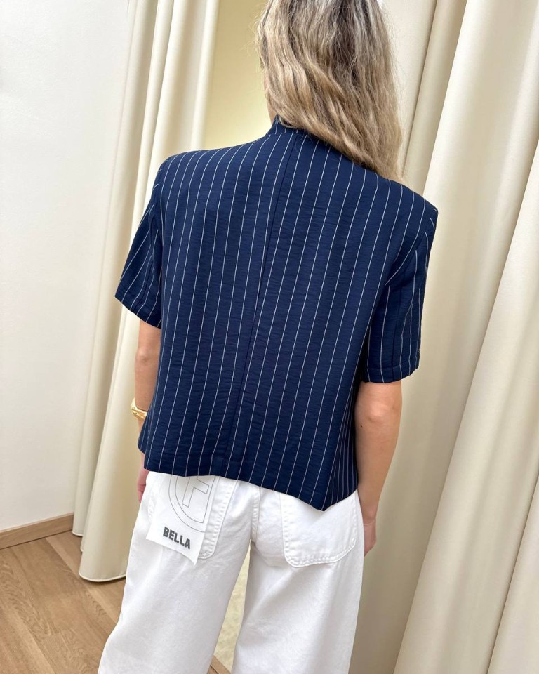 Giacca gessata blu e bianca, modello corto, coreana con rever chiuso da due bottoni, tre tasche a filetto, manica corta, spalline imbottite. Sfoderata. Vestibilità regolare.