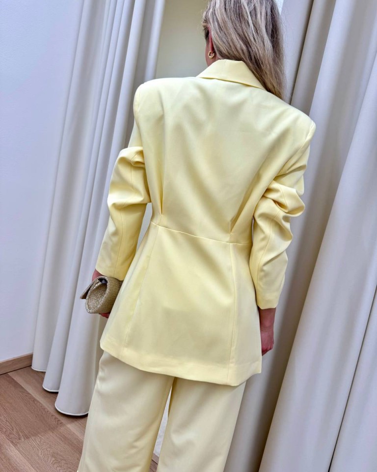 Giacca color giallo pastello, modello avvitato doppiopetto con rever classico e abbottonatura laterale con drappeggio, pieghe sul dietro, manica lunga con spalline imbottite, foderata. Vestibilità regolare.