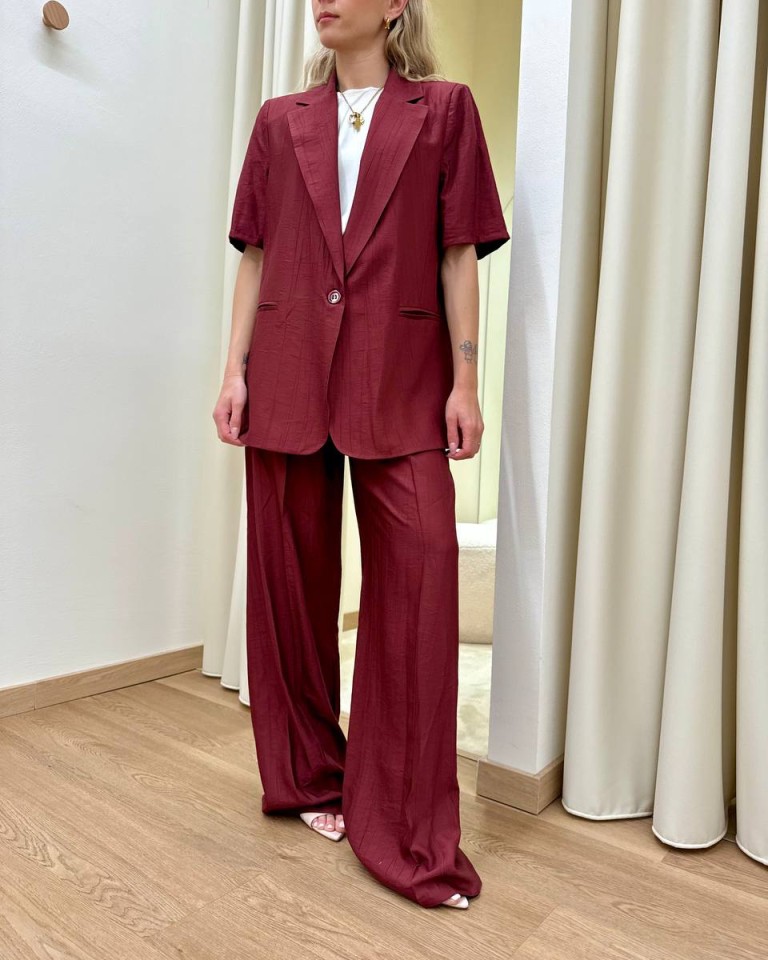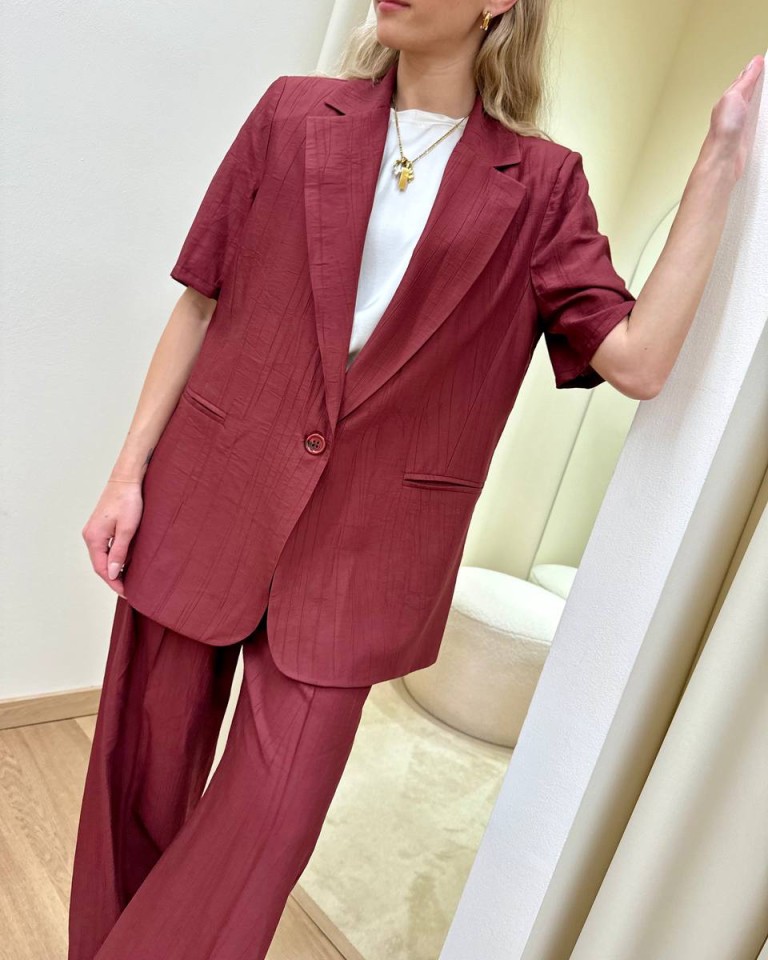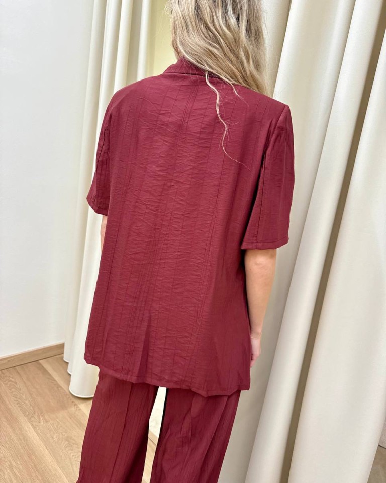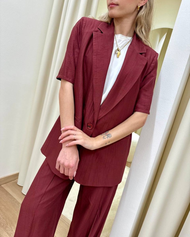 Giacca effetto stropicciato color bordeaux, modello over con rever classico e chiusura con un bottone, maniche corte, tasche con patta, sfoderata. Vestibilità ampia.